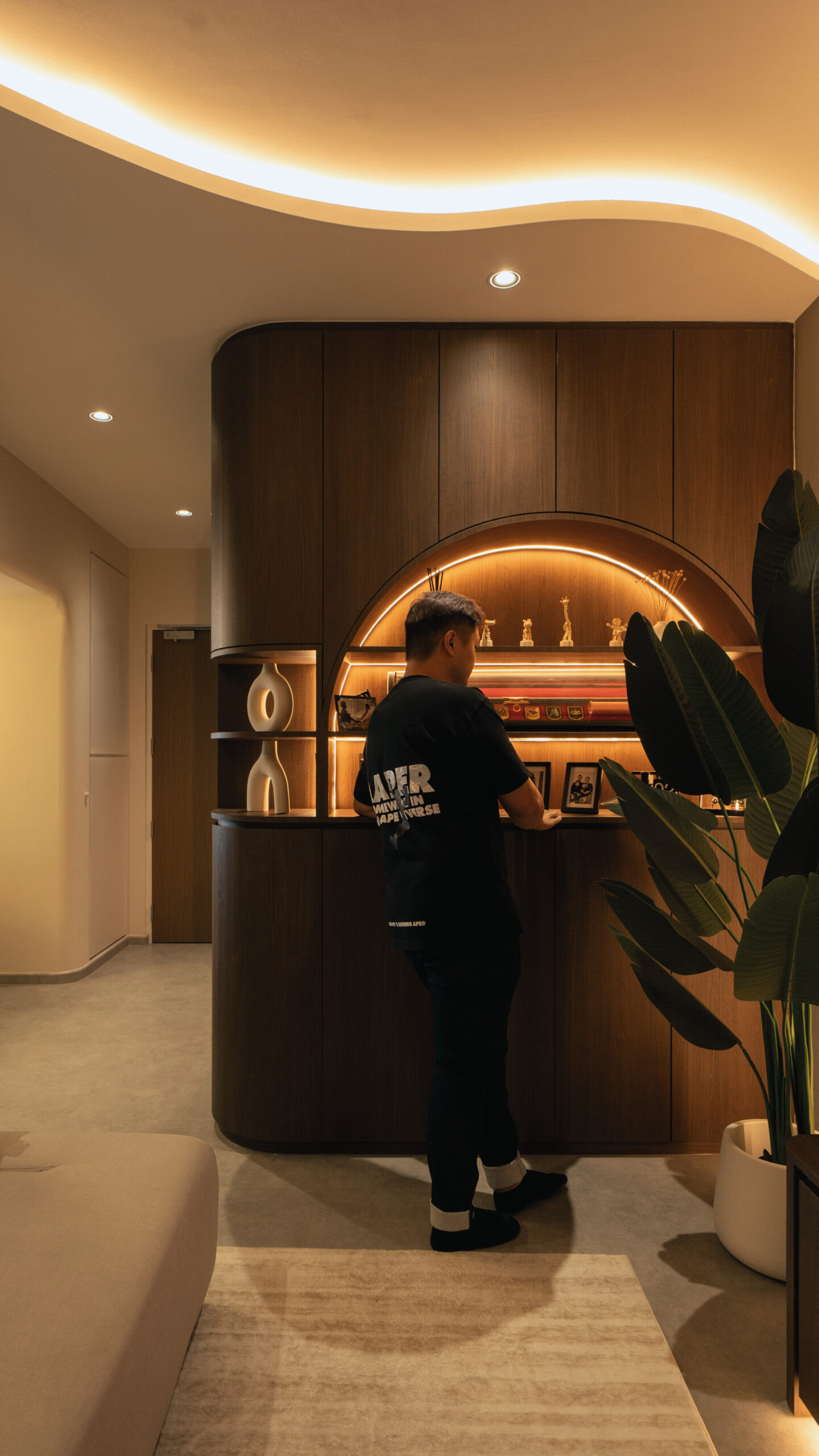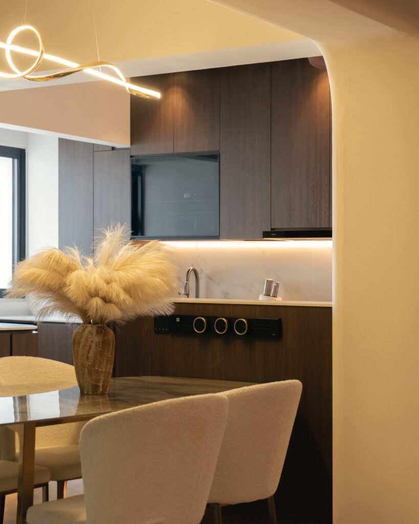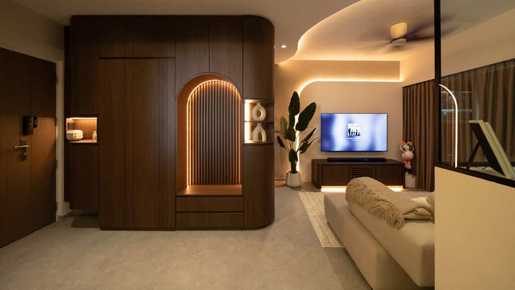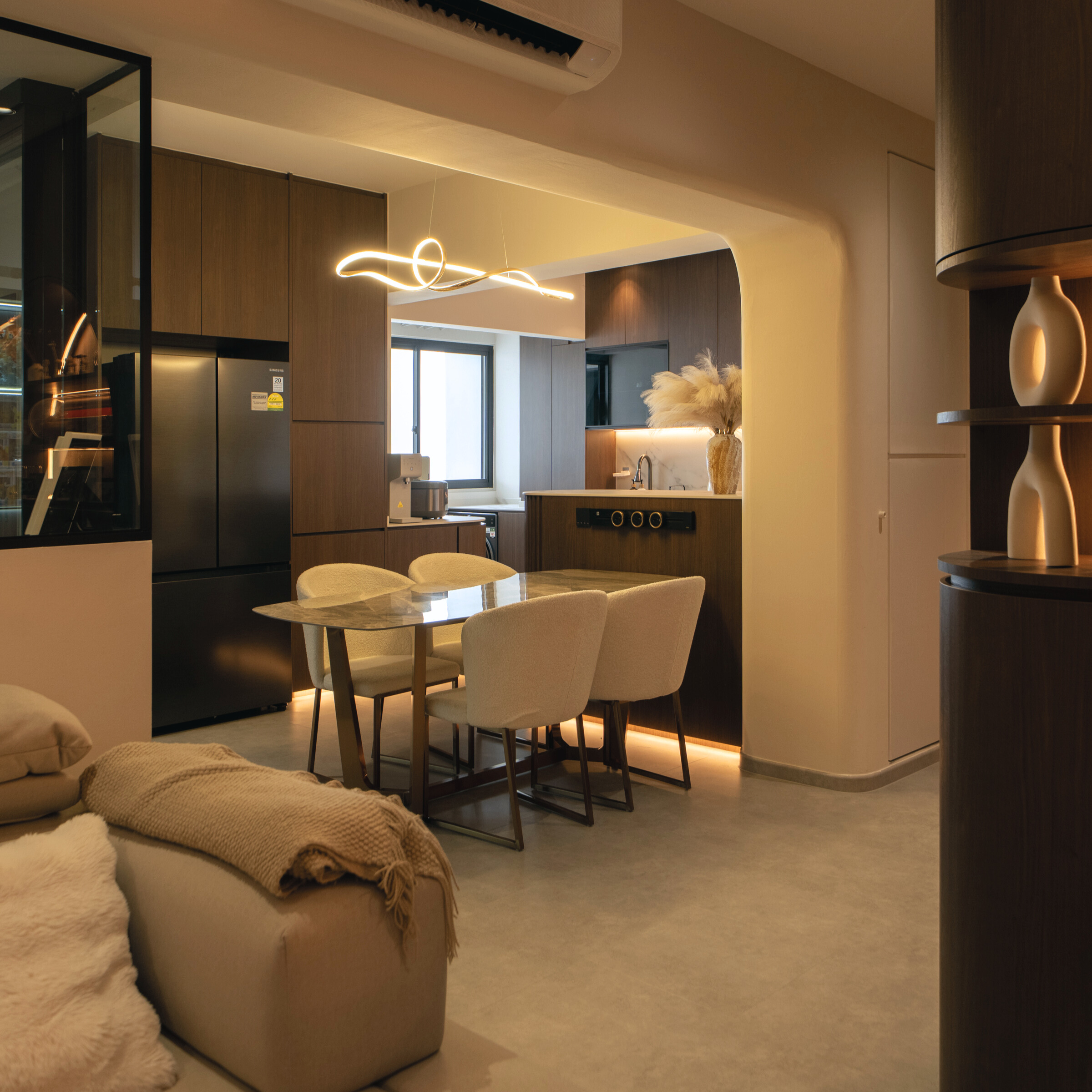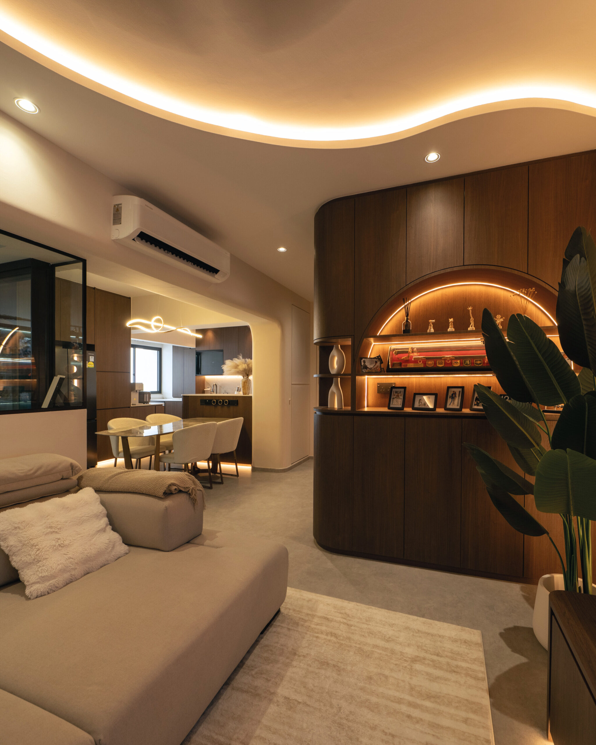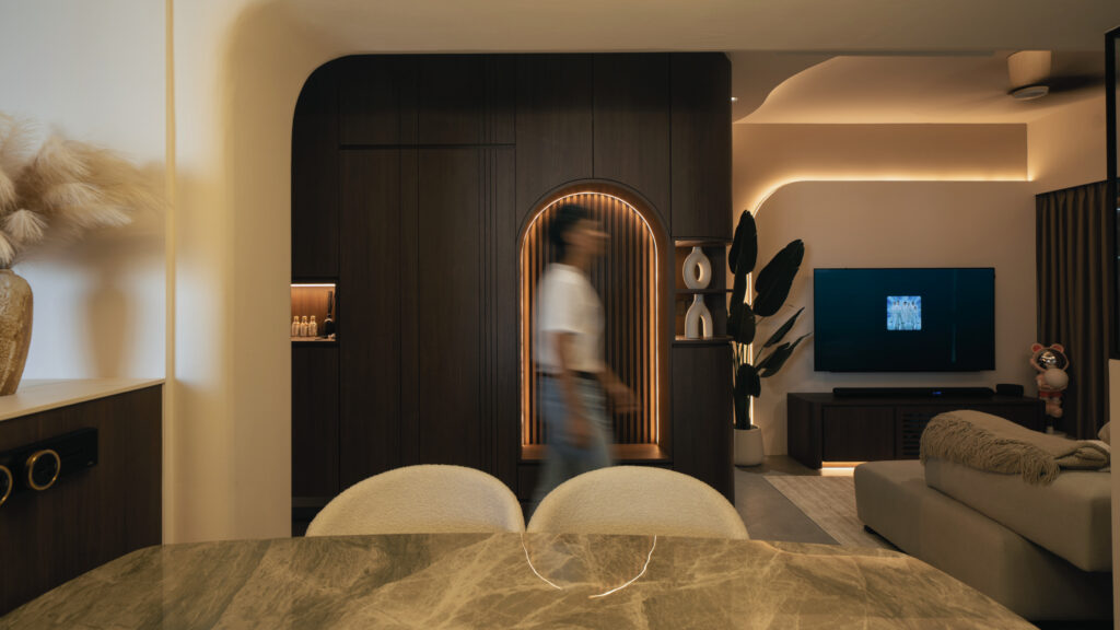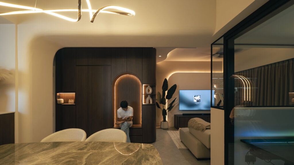 As you step inside, the soft curves of the home and warm lighting create an inviting atmosphere. The living area is perfect for winding down after a long day, enjoying movie nights, or simply taking a moment to relax. Custom woodwork adds cozy nooks without overwhelming the space. The open kitchen and dining area flow effortlessly into the living room, ideal for everyday meals and gathering with loved ones. With warm wood tones, textured details, and layered lighting, the home feels both stylish and easy to maintain. Even the bathroom carries this inviting vibe, featuring clean lines and soft lighting to make everyday routines more soothing.