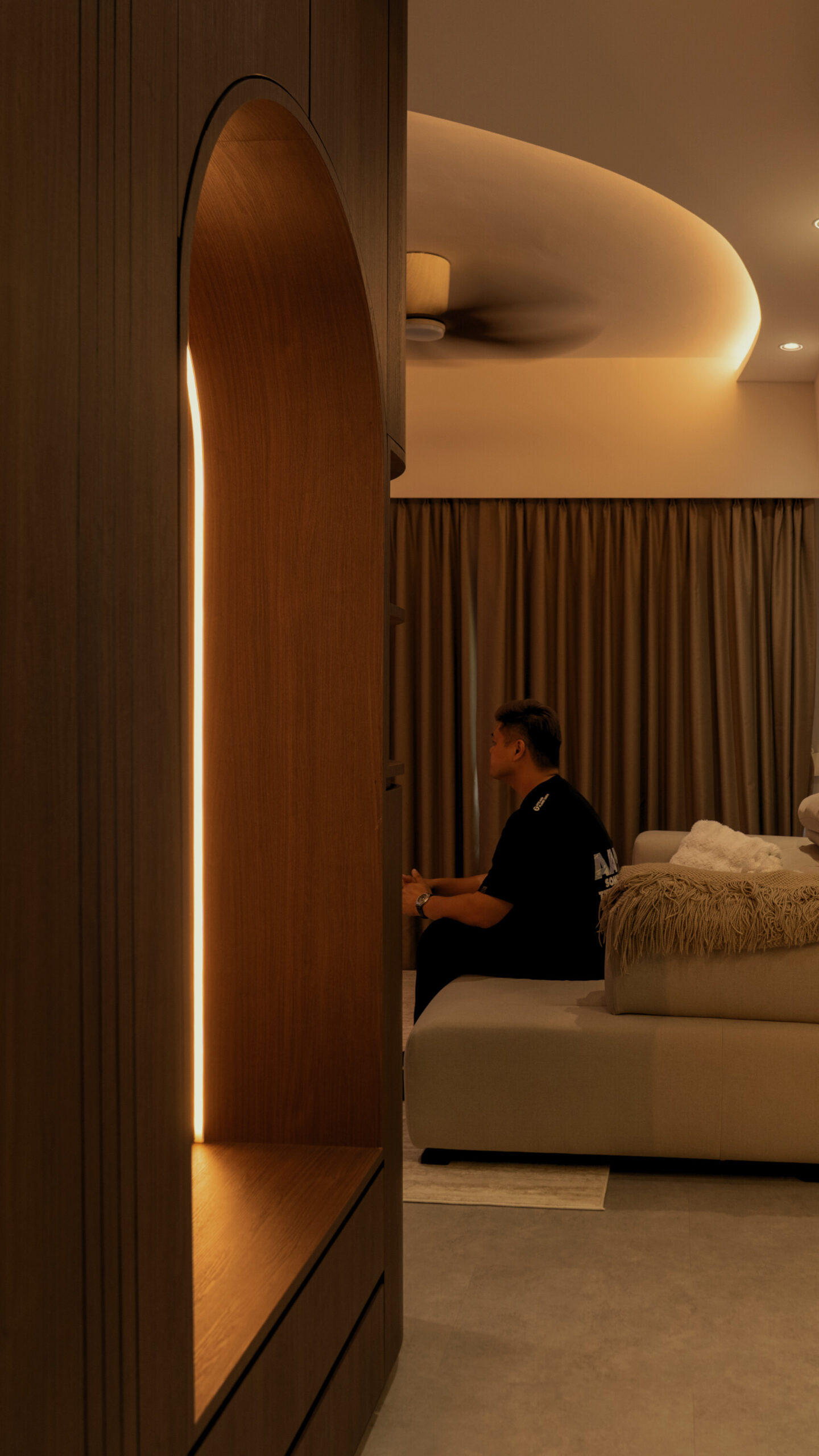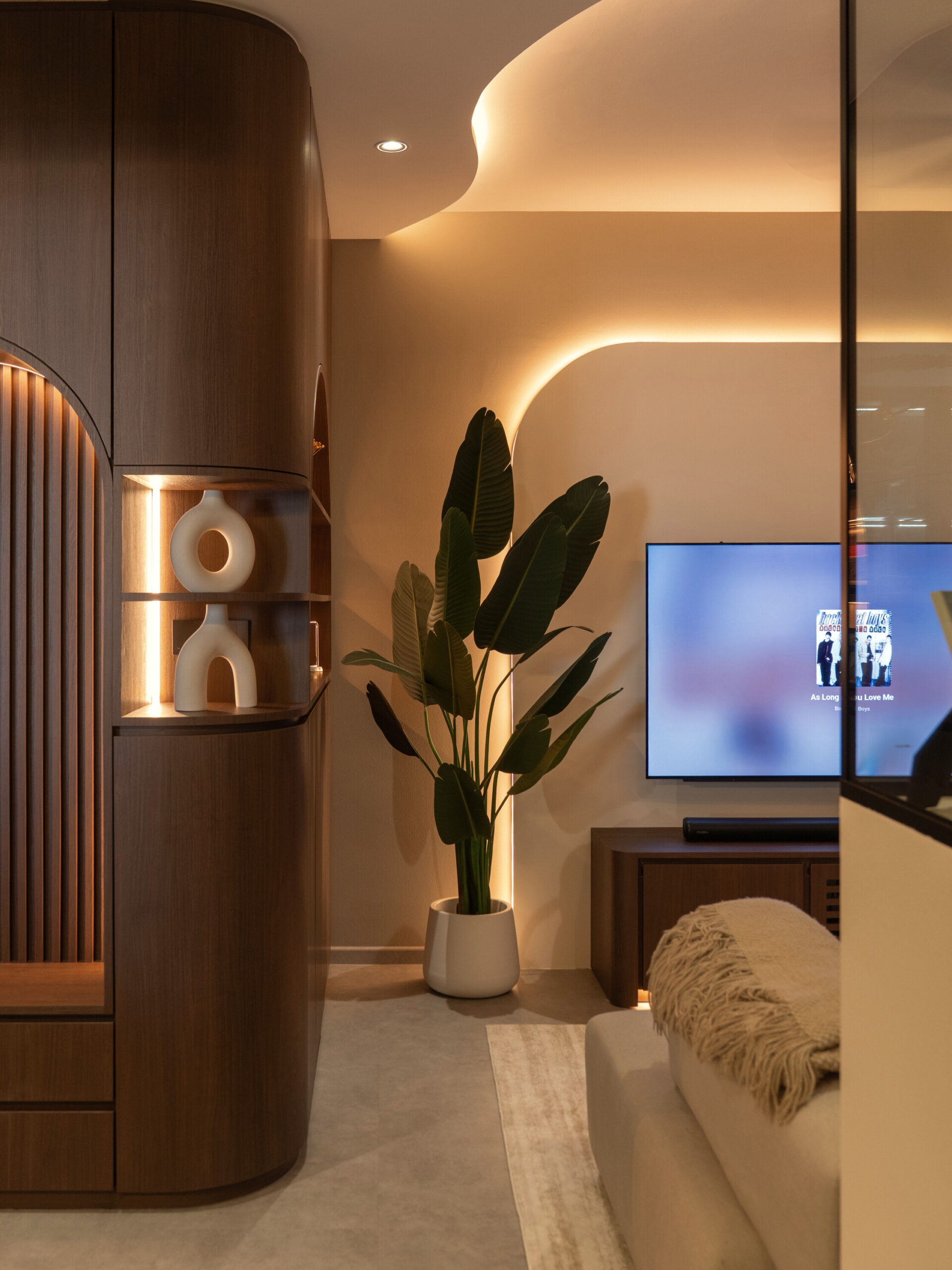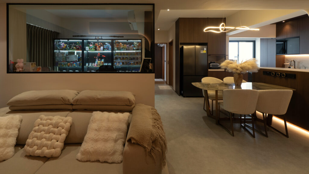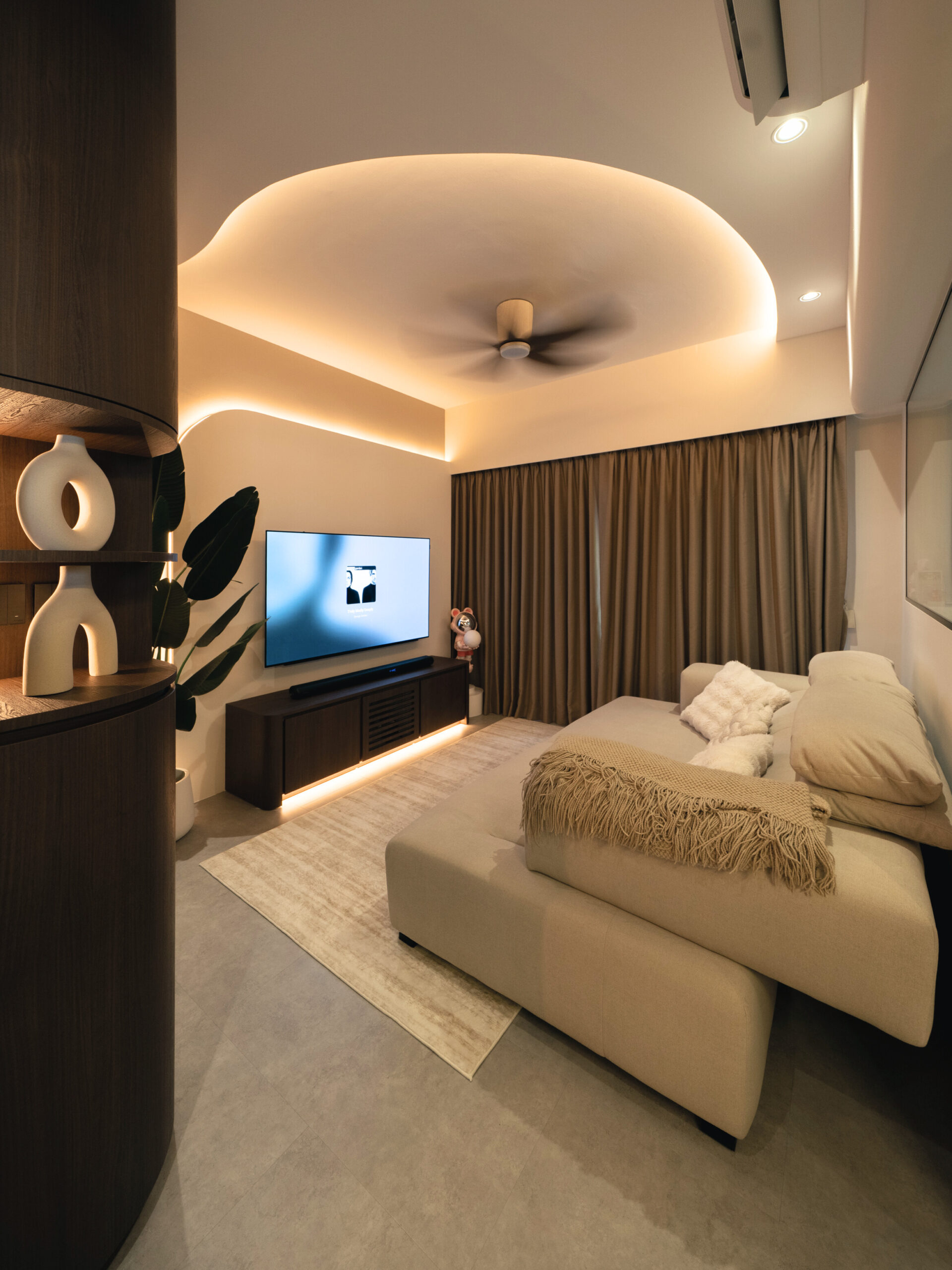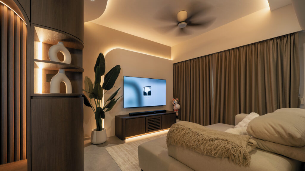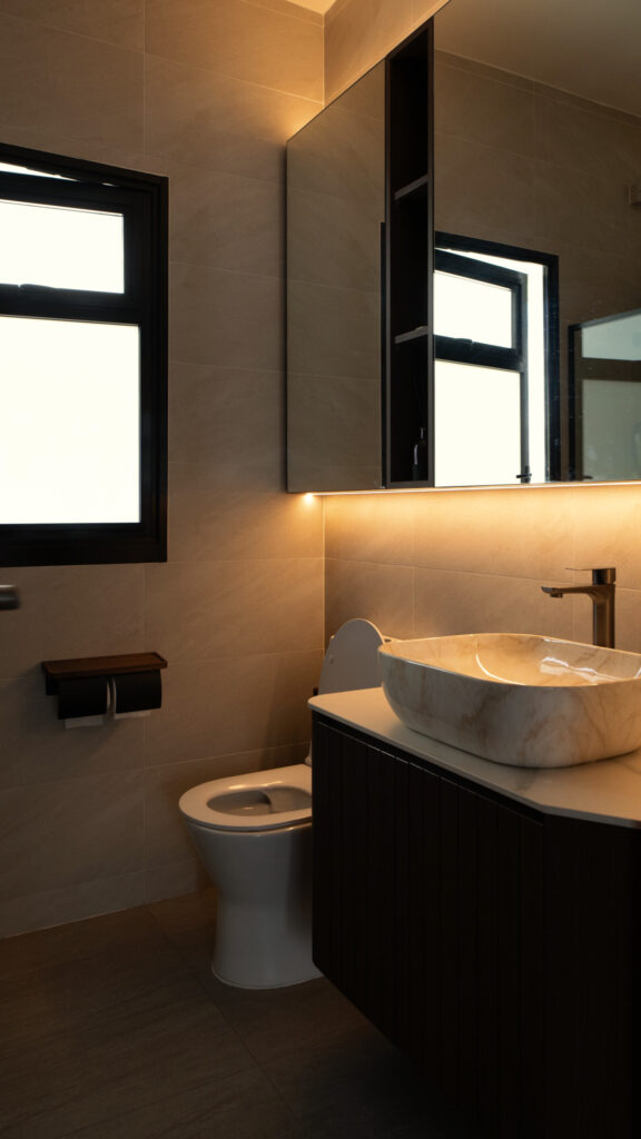 As you step inside, the soft curves of the home and warm lighting create an inviting atmosphere. The living area is perfect for winding down after a long day, enjoying movie nights, or simply taking a moment to relax. Custom woodwork adds cozy nooks without overwhelming the space. The open kitchen and dining area flow effortlessly into the living room, ideal for everyday meals and gathering with loved ones. With warm wood tones, textured details, and layered lighting, the home feels both stylish and easy to maintain. Even the bathroom carries this inviting vibe, featuring clean lines and soft lighting to make everyday routines more soothing.