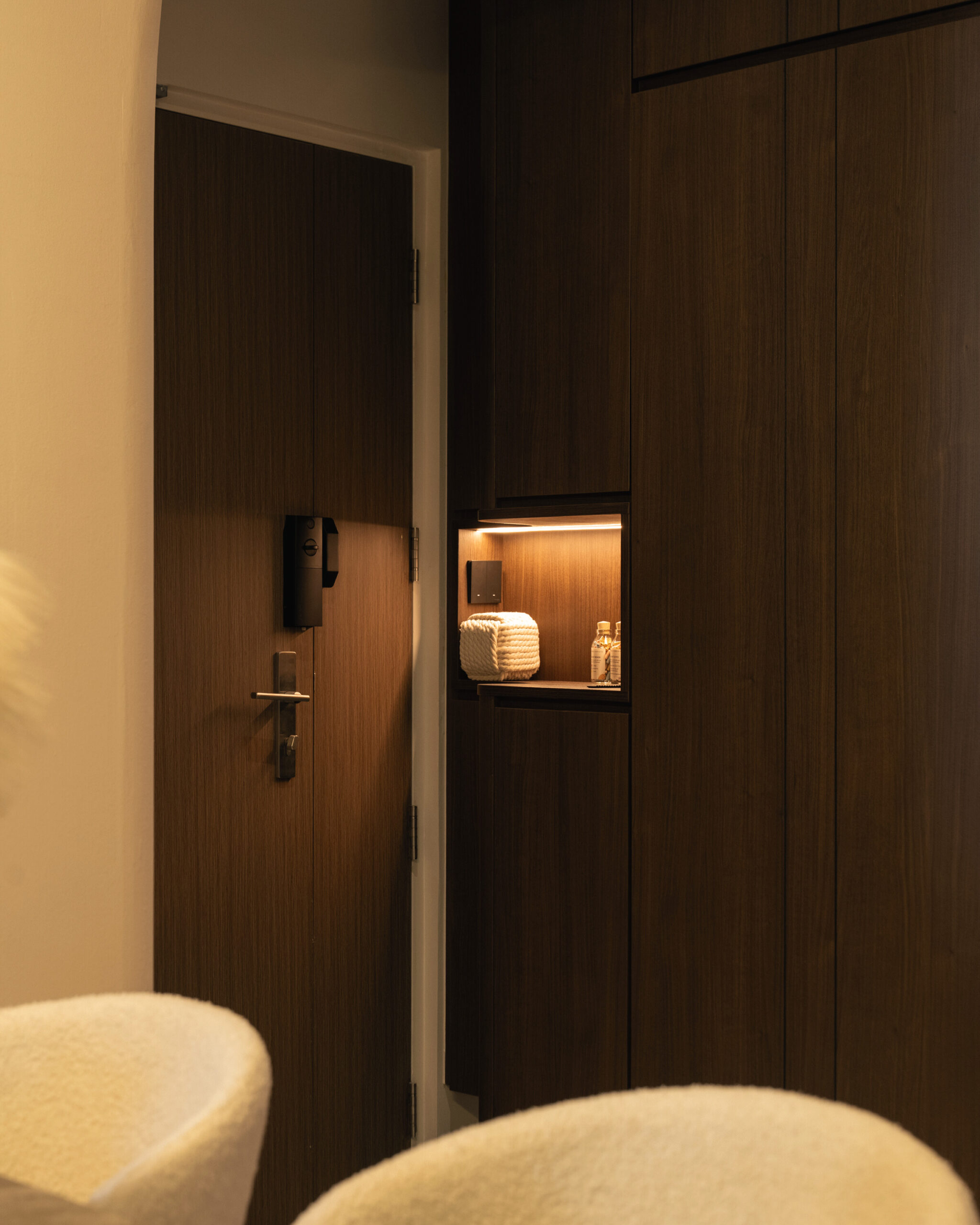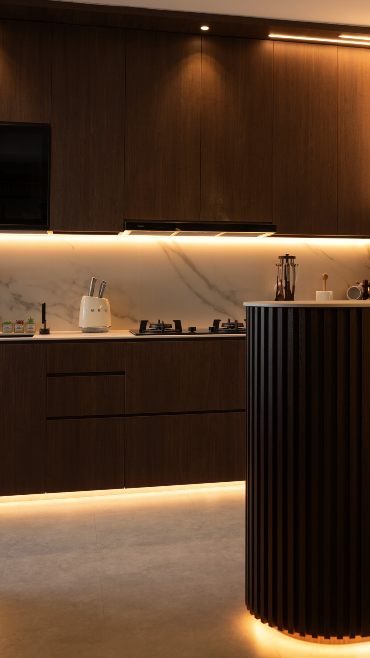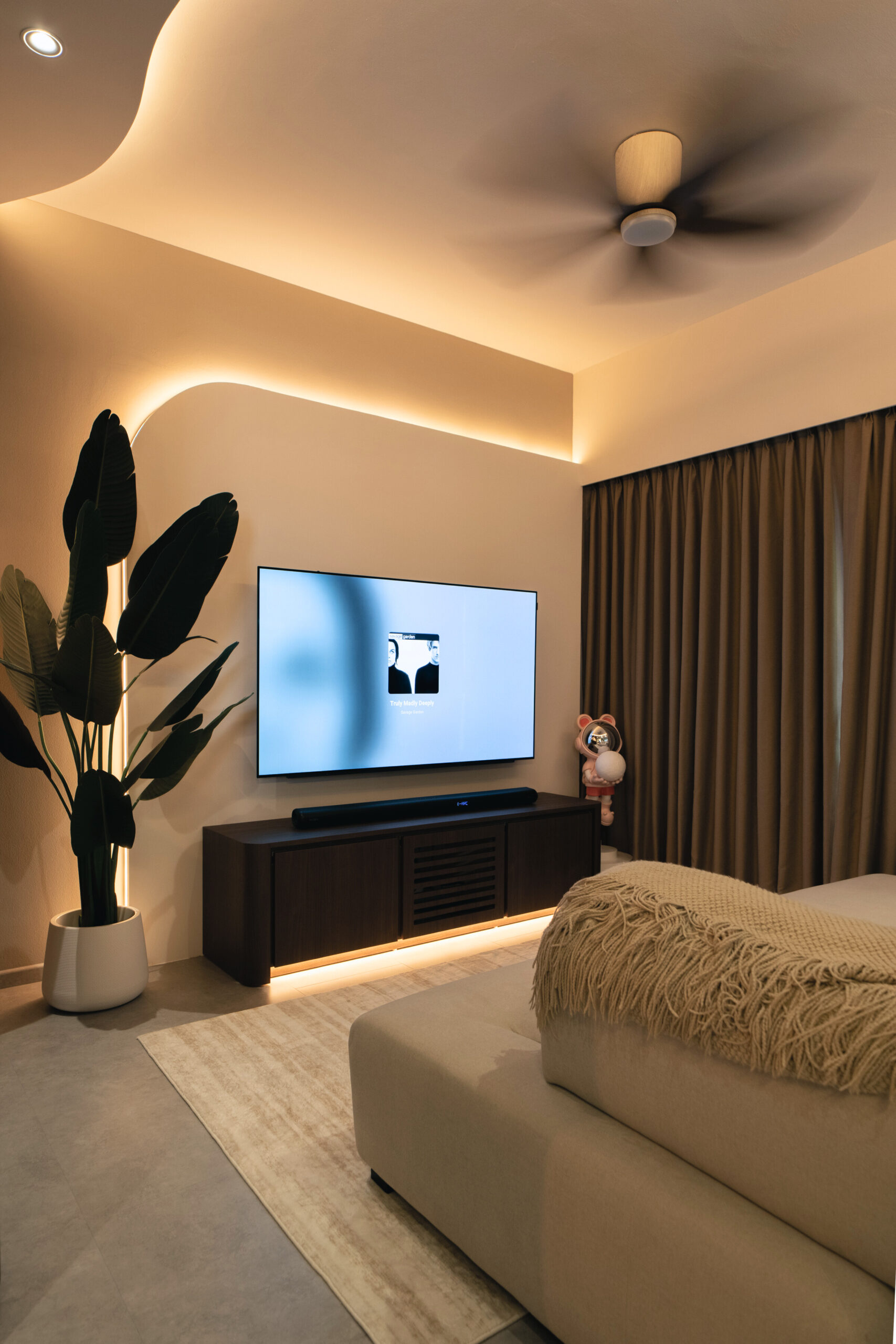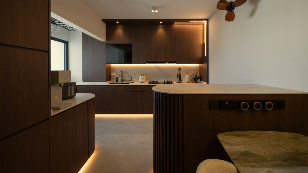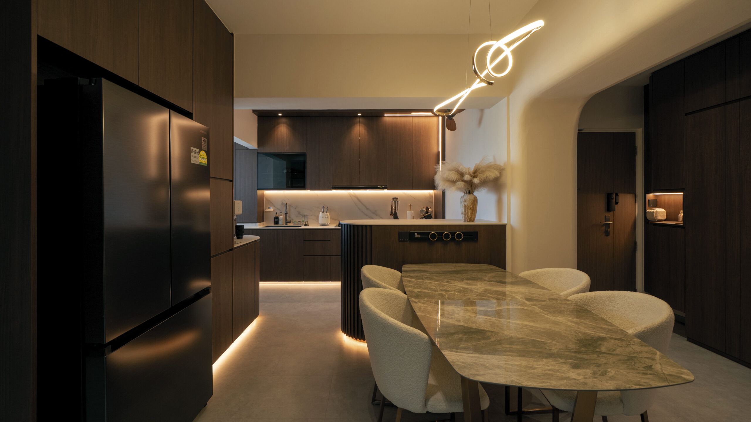 As you step inside, the soft curves of the home and warm lighting create an inviting atmosphere. The living area is perfect for winding down after a long day, enjoying movie nights, or simply taking a moment to relax. Custom woodwork adds cozy nooks without overwhelming the space. The open kitchen and dining area flow effortlessly into the living room, ideal for everyday meals and gathering with loved ones. With warm wood tones, textured details, and layered lighting, the home feels both stylish and easy to maintain. Even the bathroom carries this inviting vibe, featuring clean lines and soft lighting to make everyday routines more soothing.