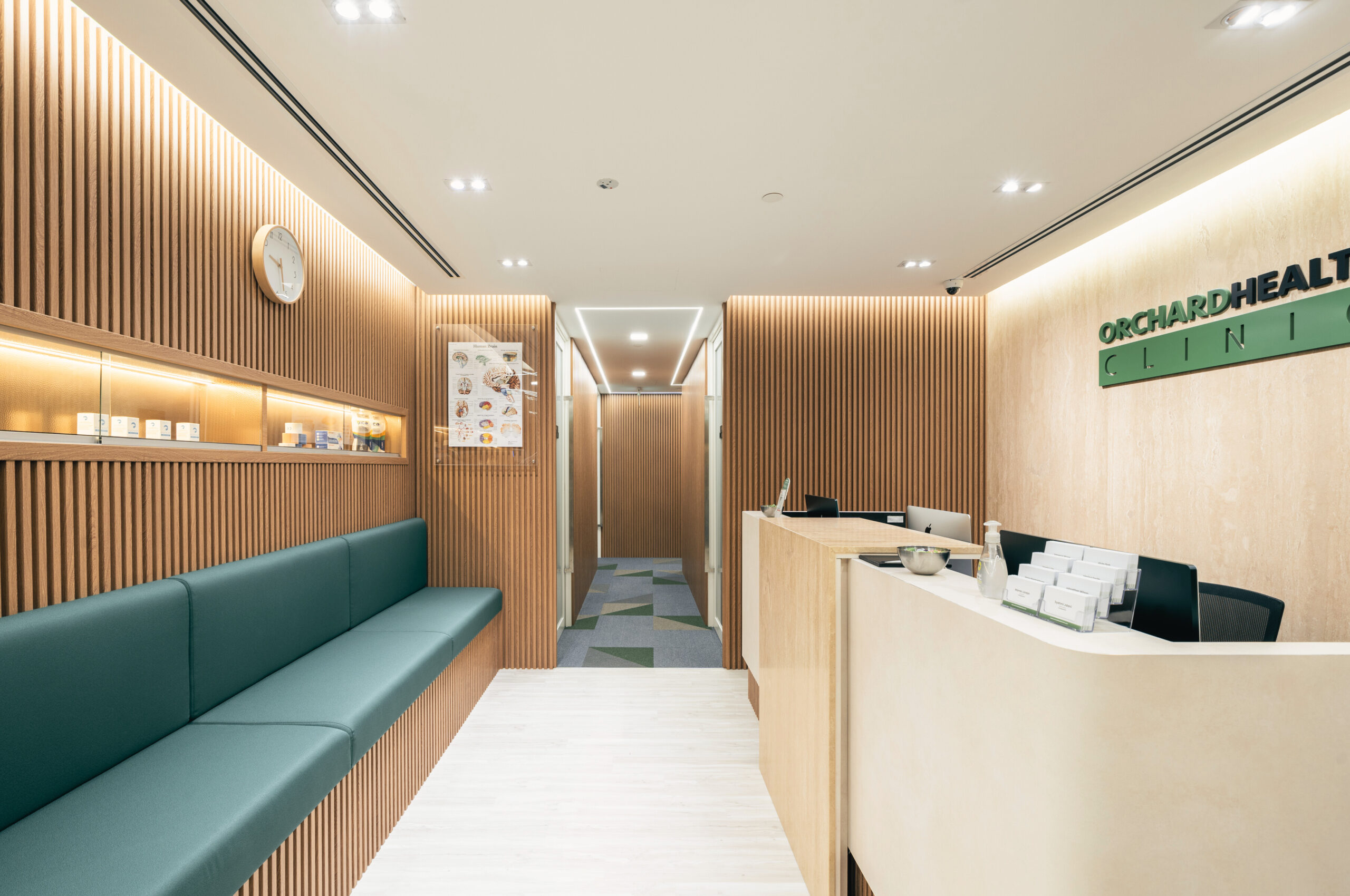 This modern healthcare space was designed to provide patients with a calming and welcoming environment. The clinic features a warm wood-toned palette, soft ambient lighting, and clean lines that enhance comfort and professionalism. Thoughtful details like fluted wall panels, mirror accents, and sleek reception counters create a contemporary aesthetic, while the consultation and treatment rooms are kept minimal and functional. The design balances wellness with elegance, ensuring a serene atmosphere for both patients and staff.