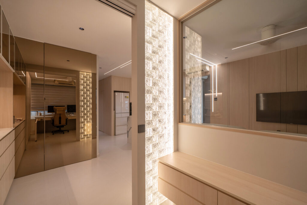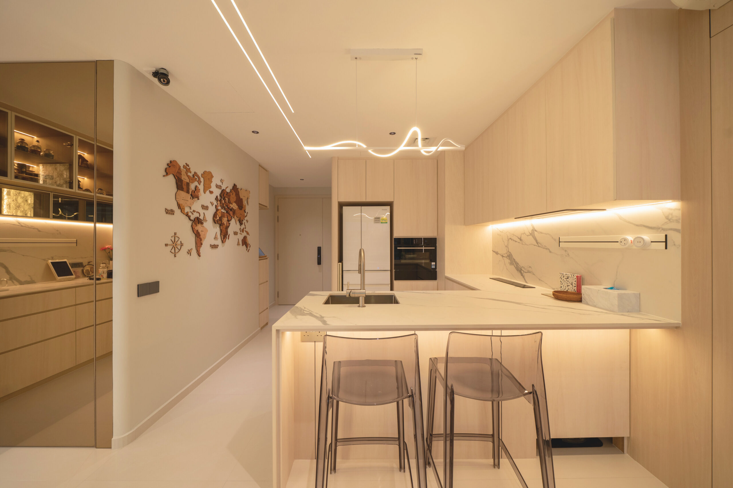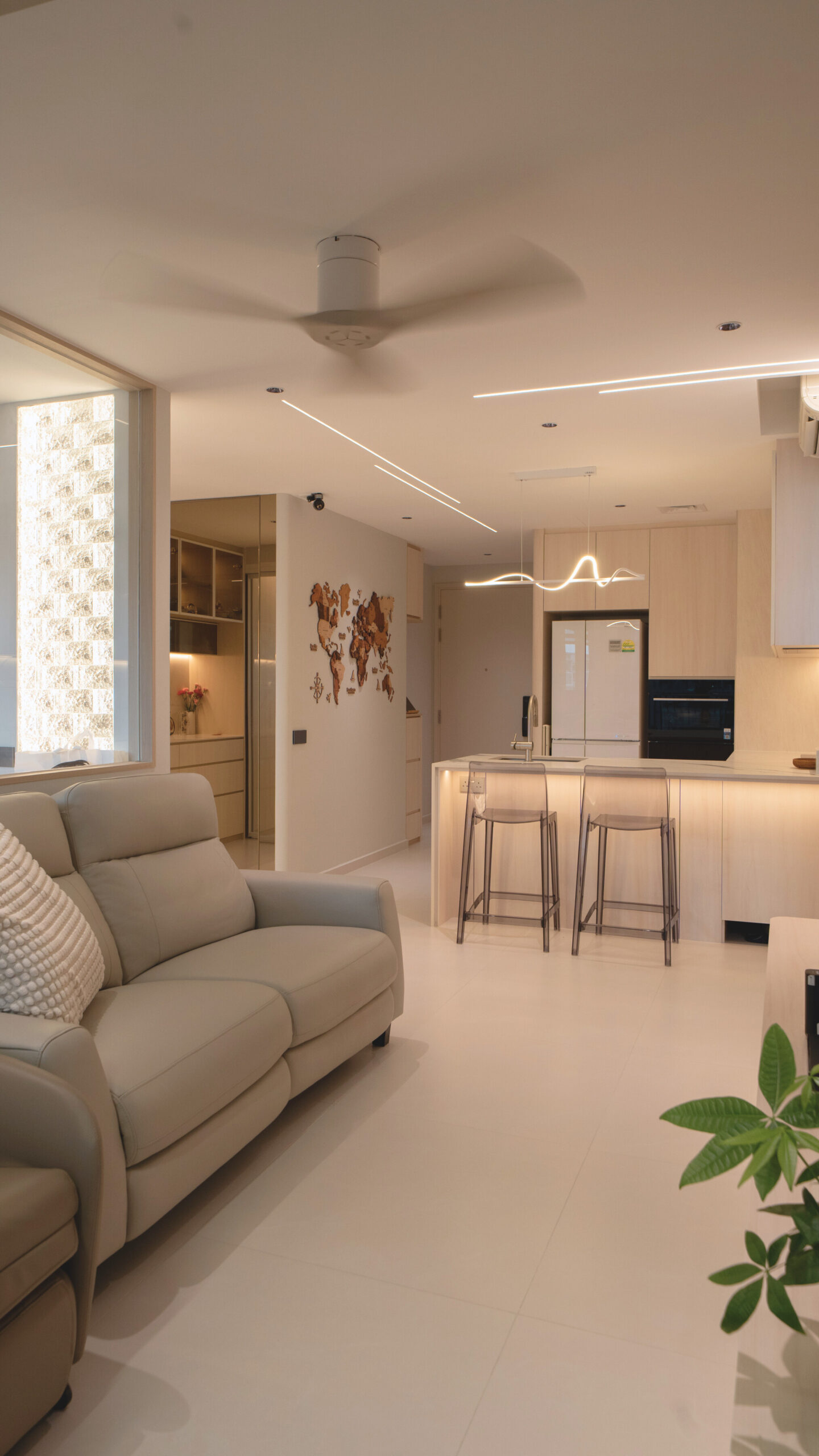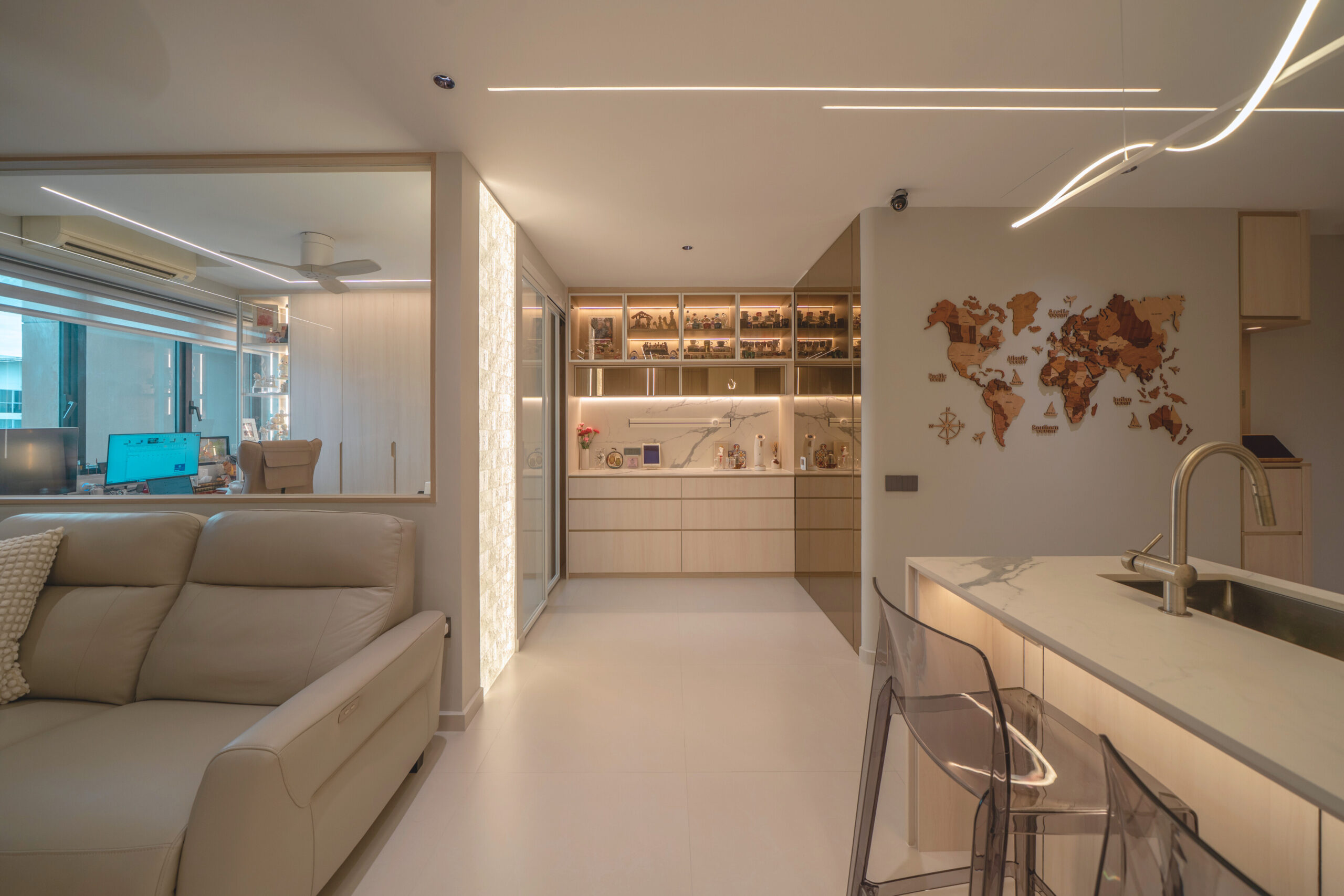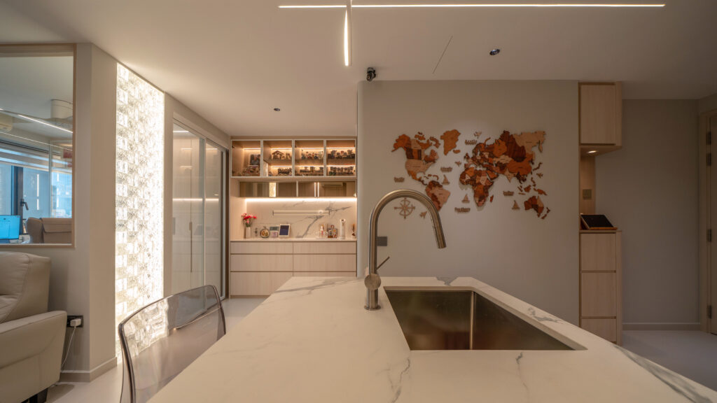 This home showcases a warm modern style with soft neutral colors, hidden storage, and smooth built-ins. A glass-enclosed study keeps the area open and bright. Backlit display shelves and a sculptural world-map feature wall add character. Soft lighting lines, marble-like surfaces, and clear furniture finish off the light, modern atmosphere.