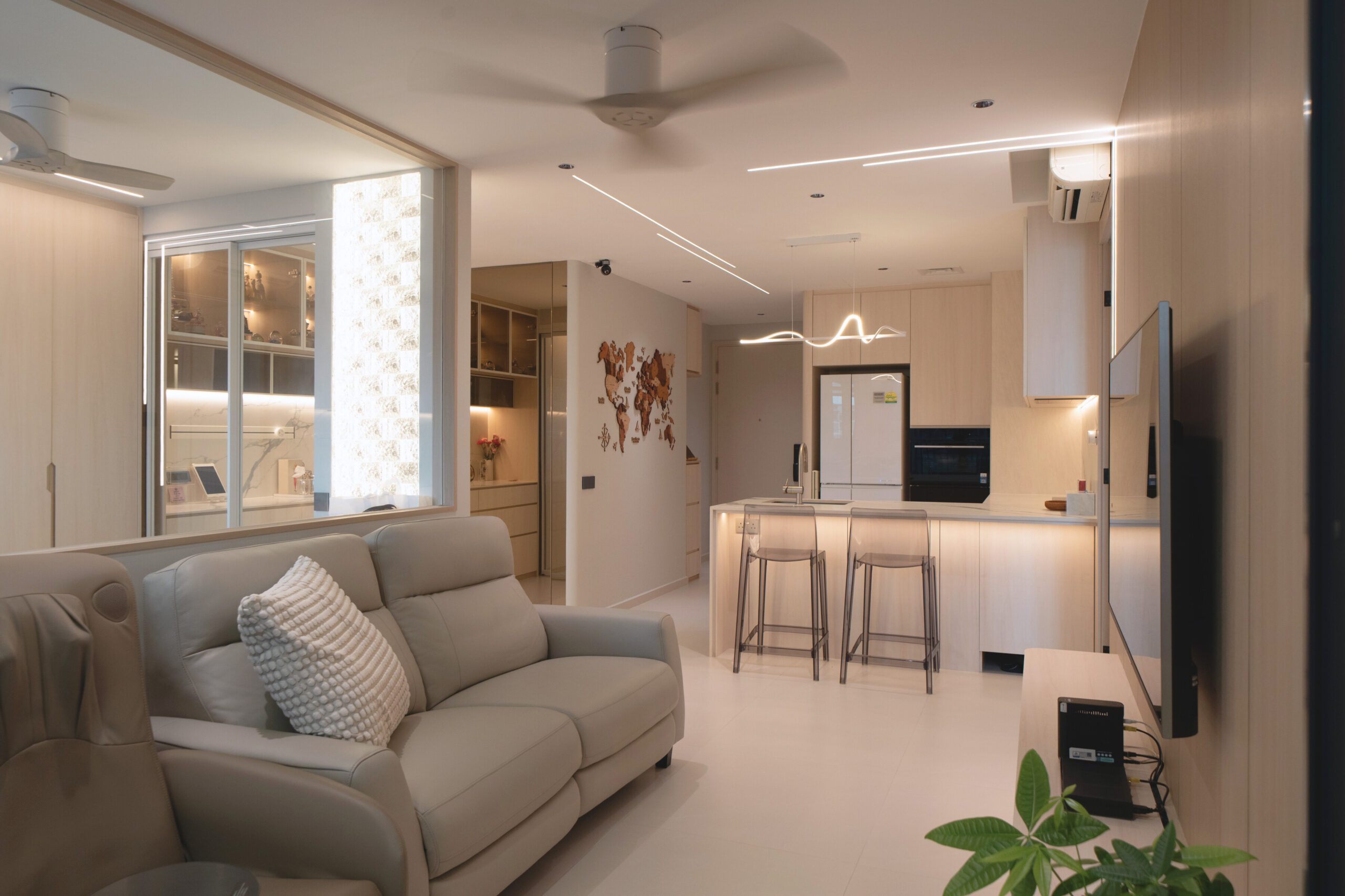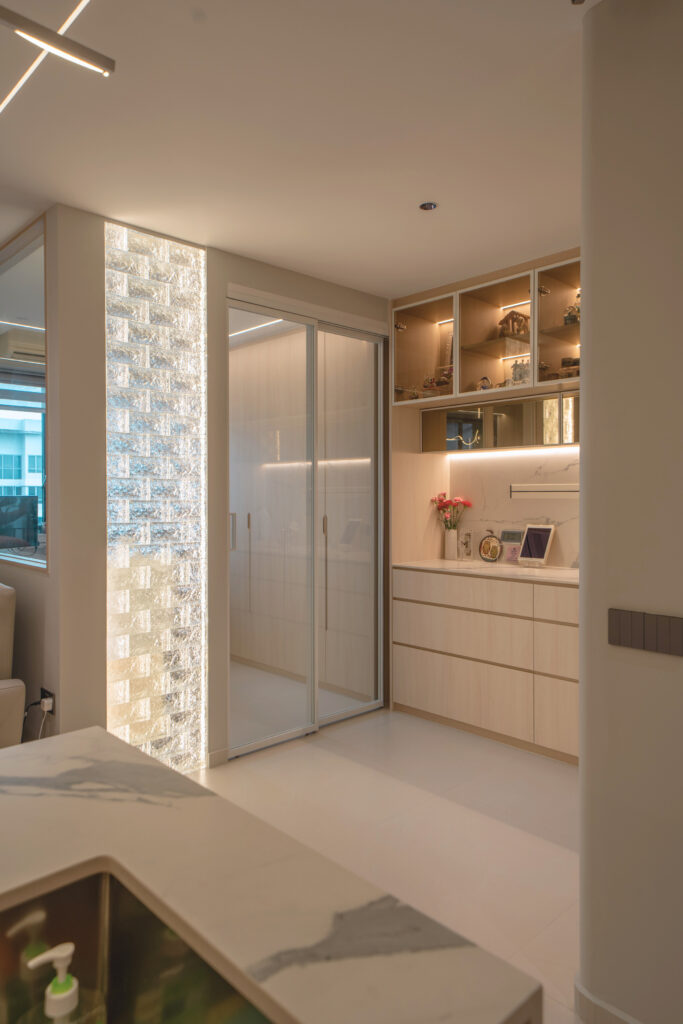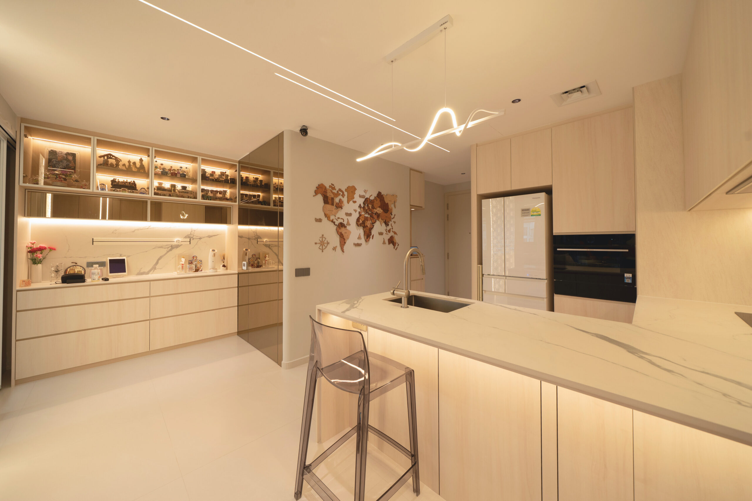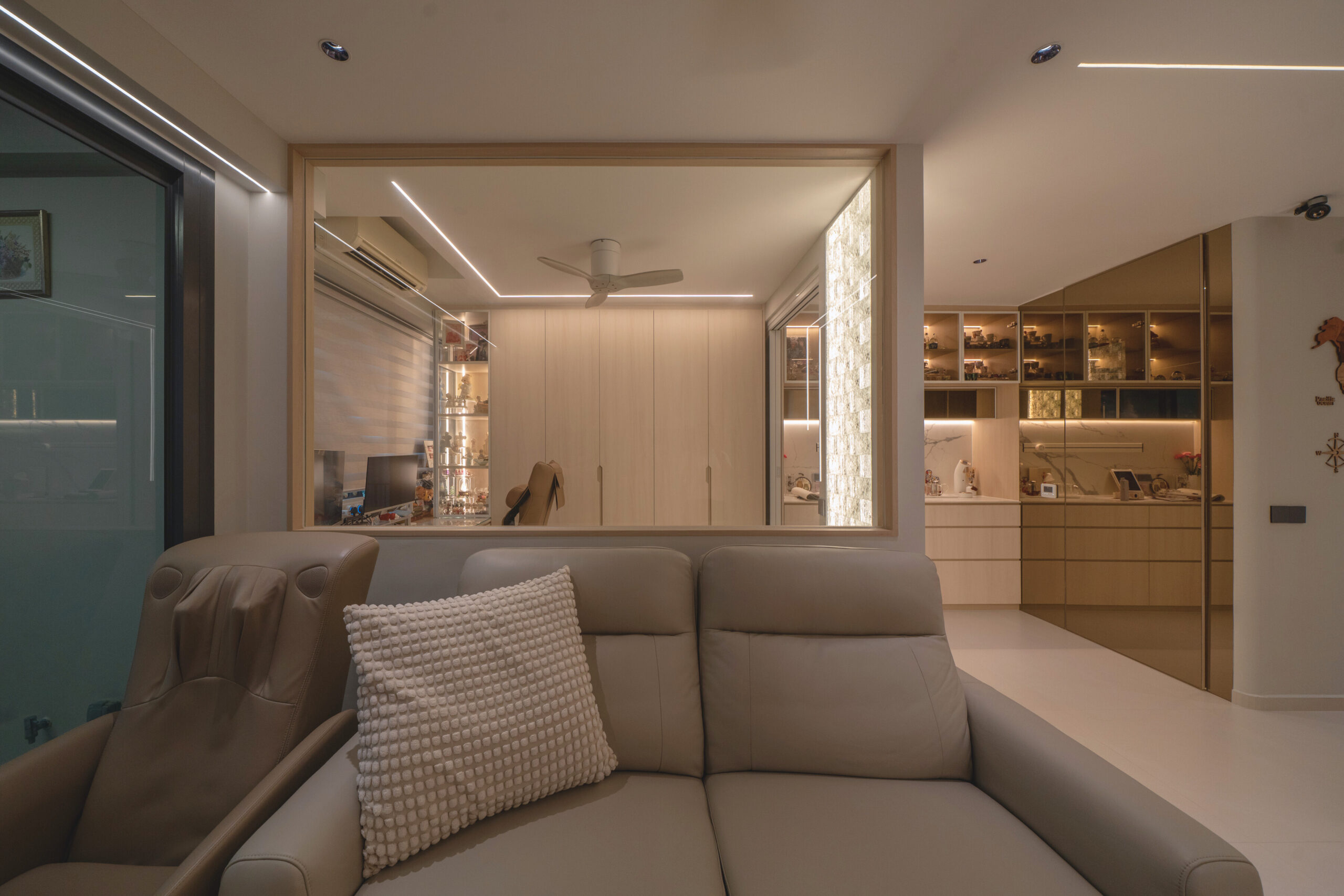This home showcases a warm modern style with soft neutral colors, hidden storage, and smooth built-ins. A glass-enclosed study keeps the area open and bright. Backlit display shelves and a sculptural world-map feature wall add character. Soft lighting lines, marble-like surfaces, and clear furniture finish off the light, modern atmosphere.