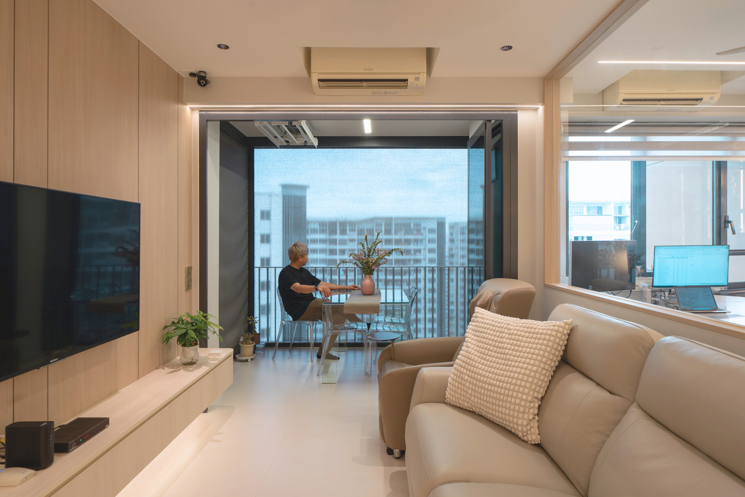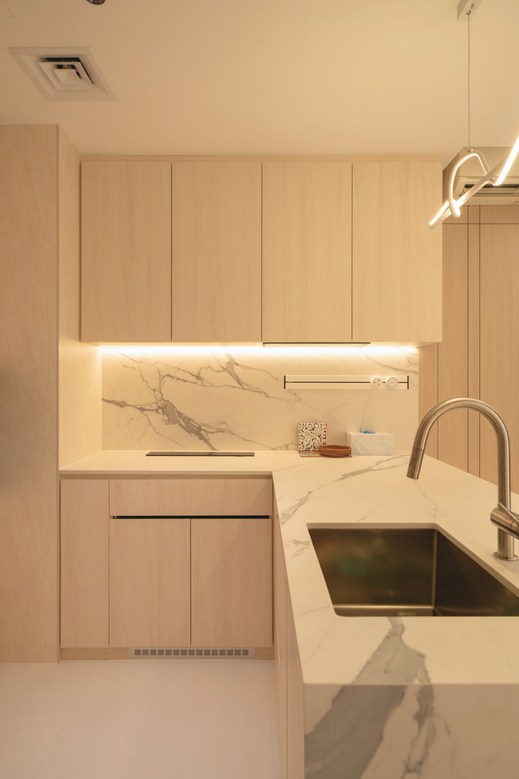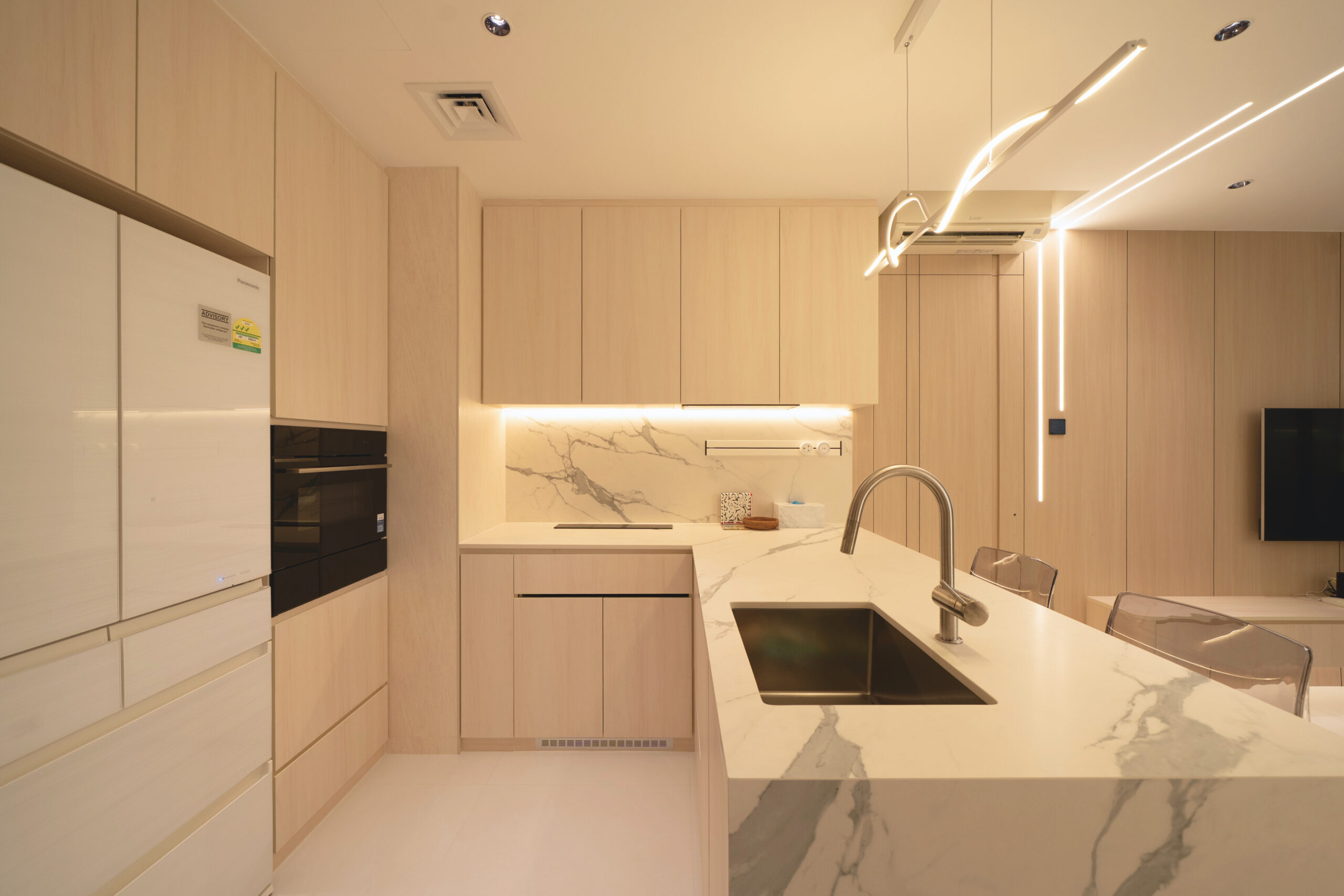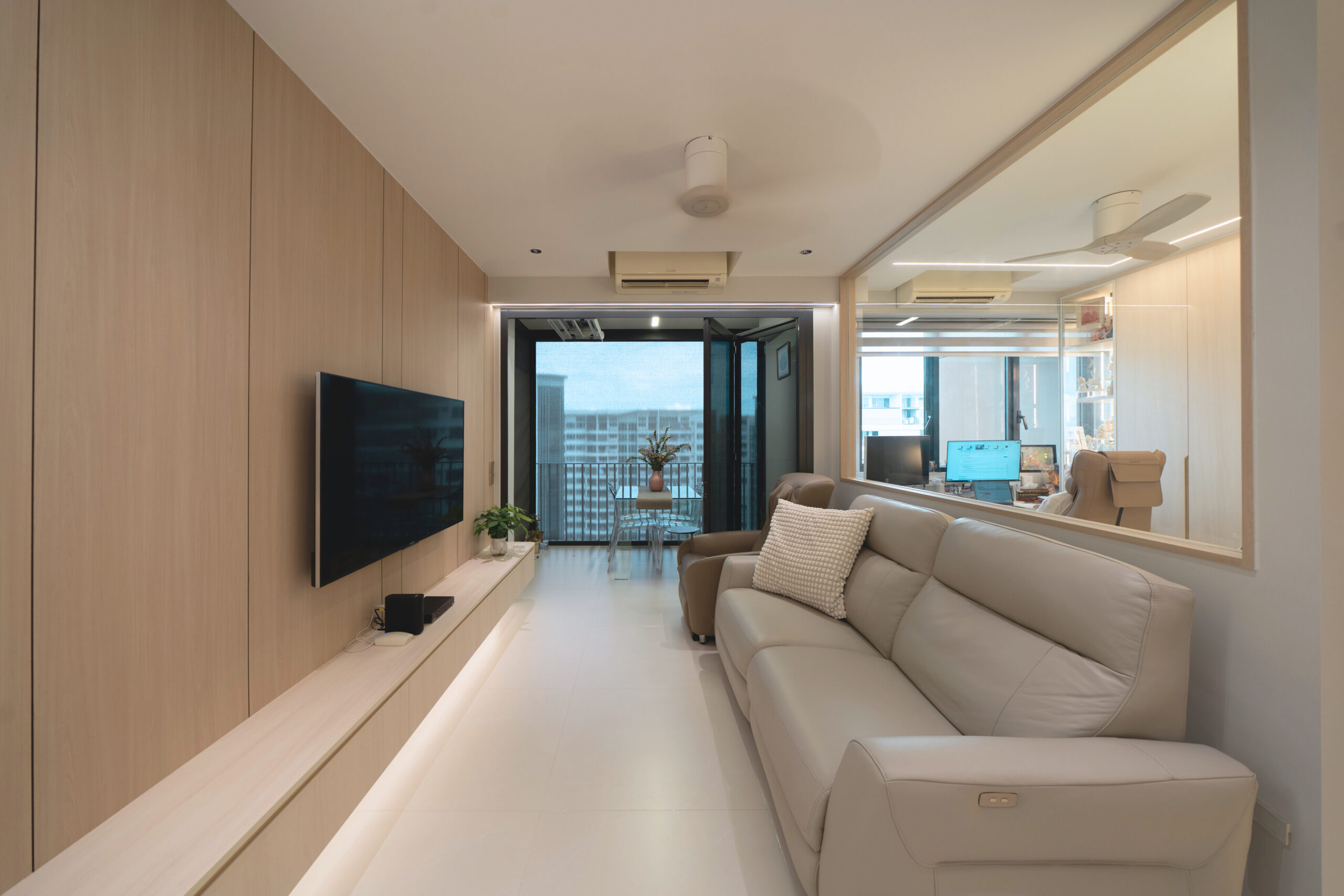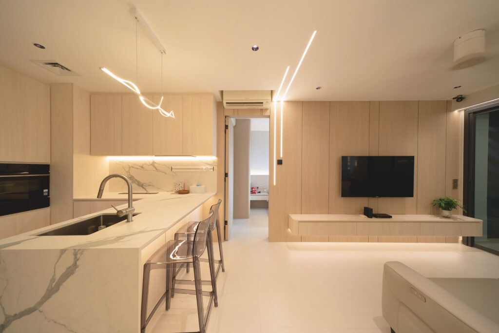 This home showcases a warm modern style with soft neutral colors, hidden storage, and smooth built-ins. A glass-enclosed study keeps the area open and bright. Backlit display shelves and a sculptural world-map feature wall add character. Soft lighting lines, marble-like surfaces, and clear furniture finish off the light, modern atmosphere.