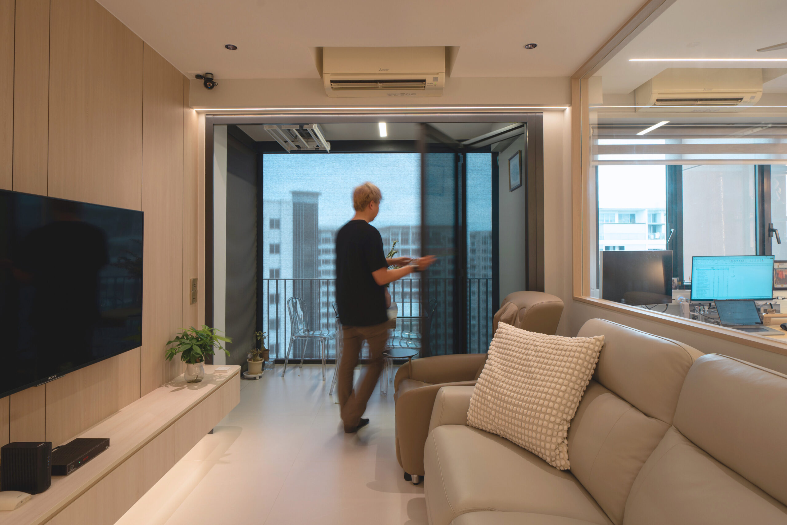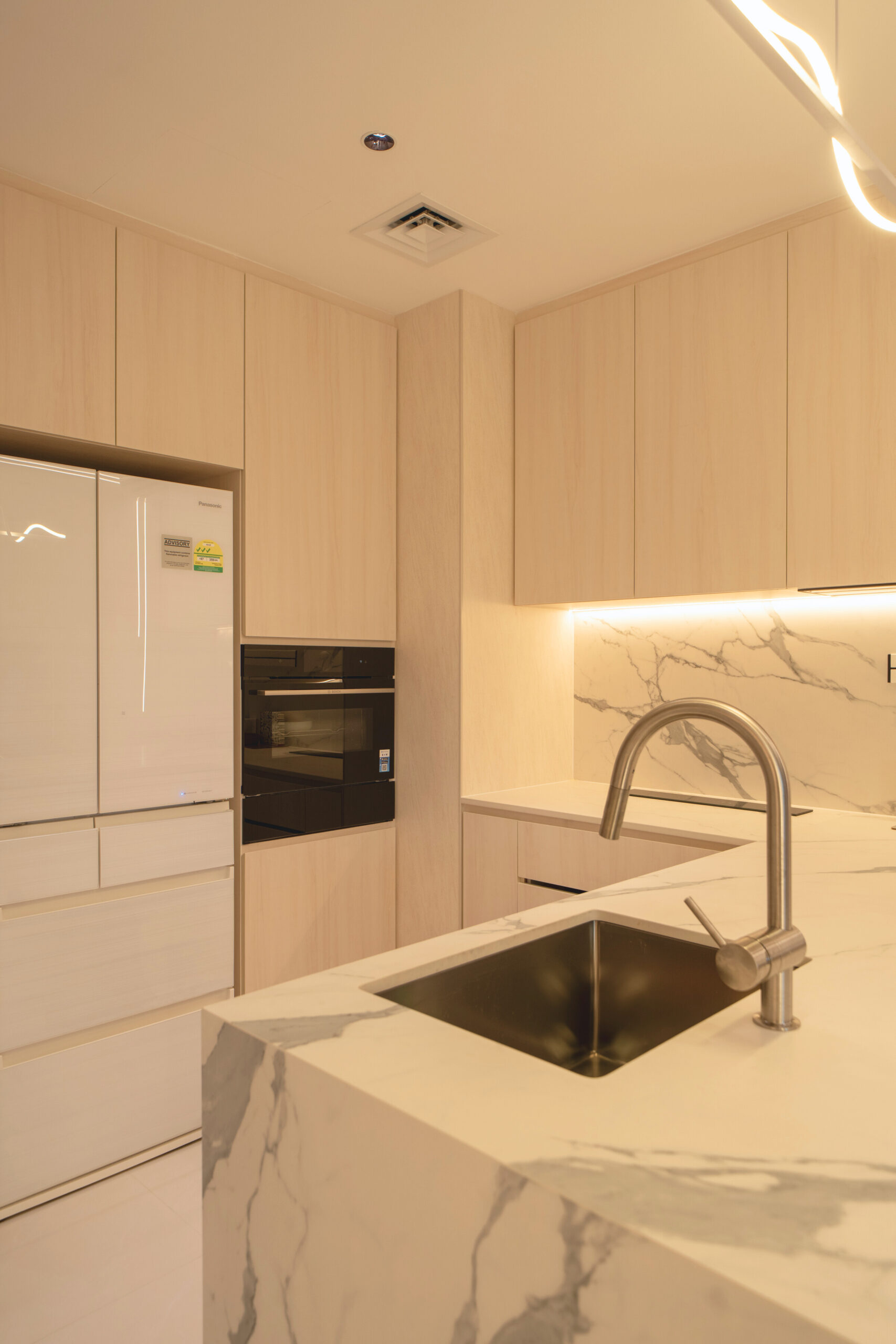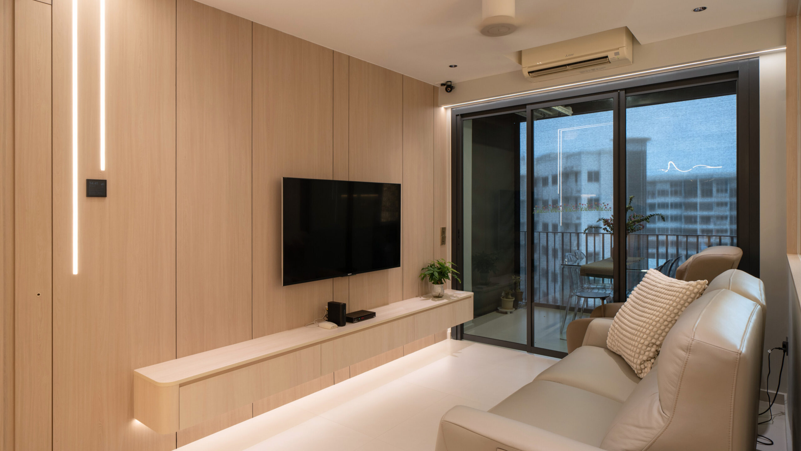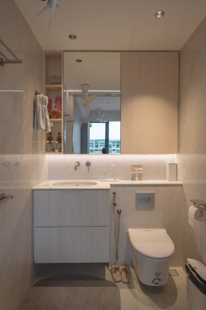 This home showcases a warm modern style with soft neutral colors, hidden storage, and smooth built-ins. A glass-enclosed study keeps the area open and bright. Backlit display shelves and a sculptural world-map feature wall add character. Soft lighting lines, marble-like surfaces, and clear furniture finish off the light, modern atmosphere.