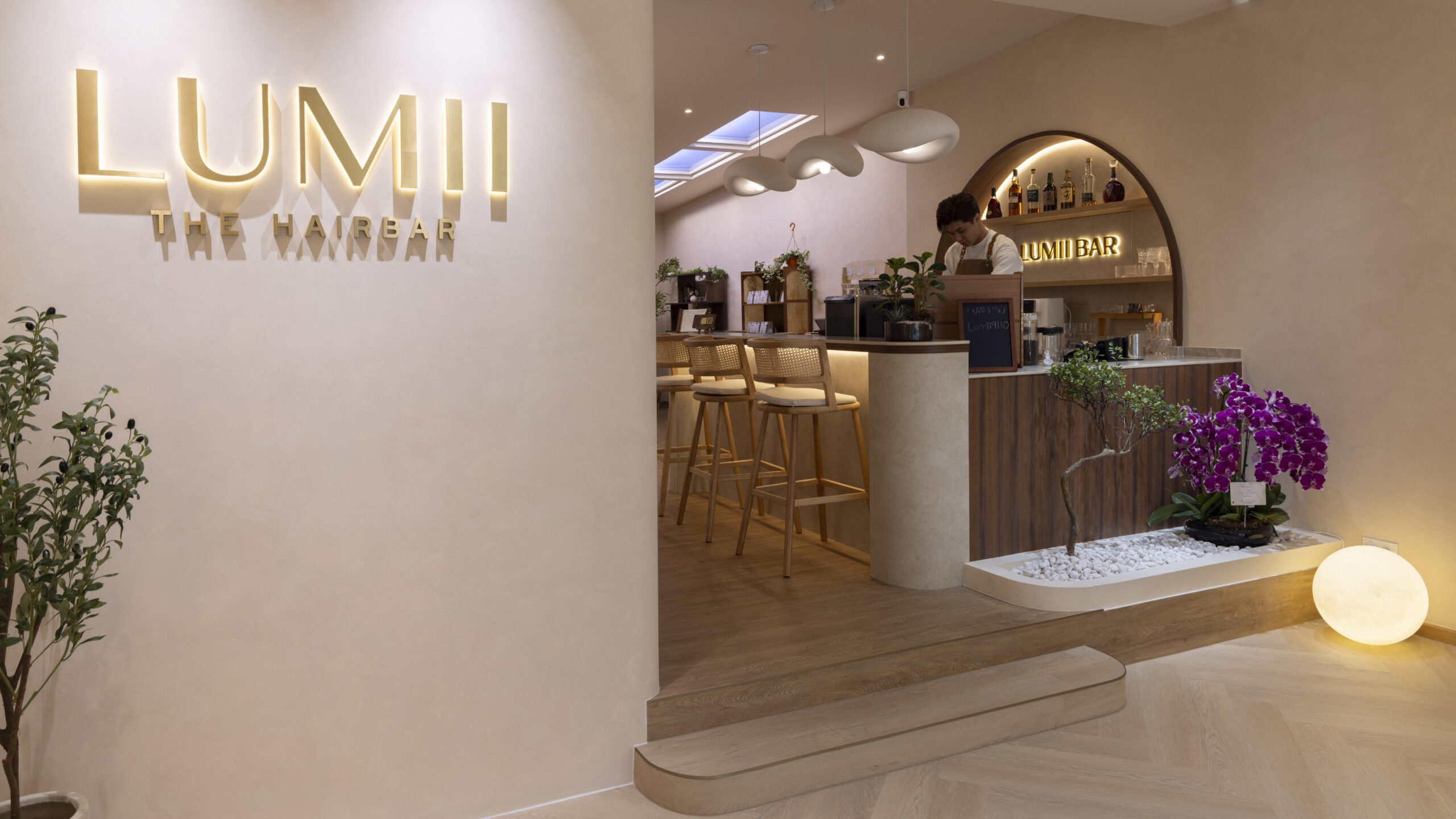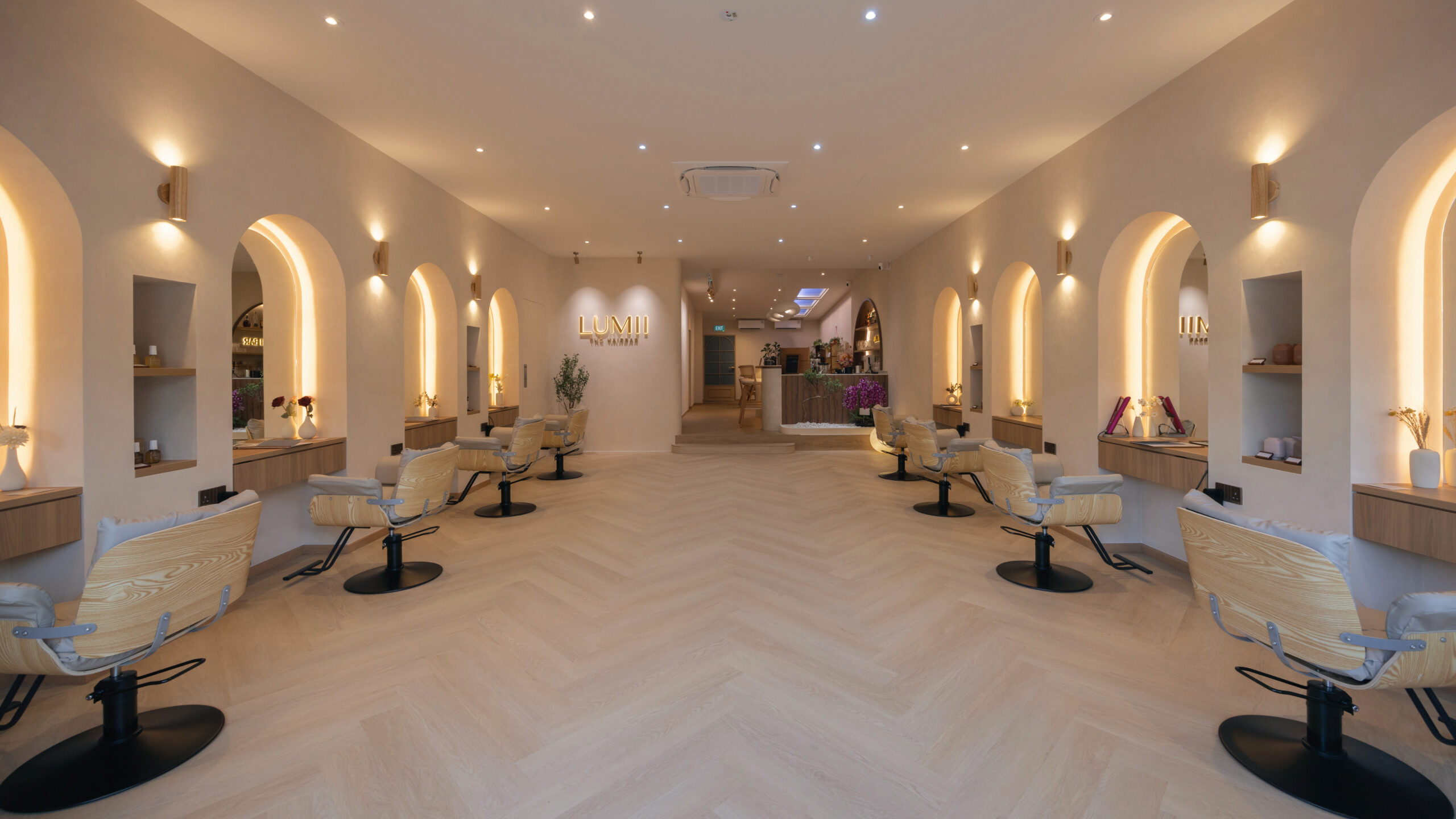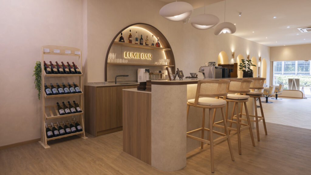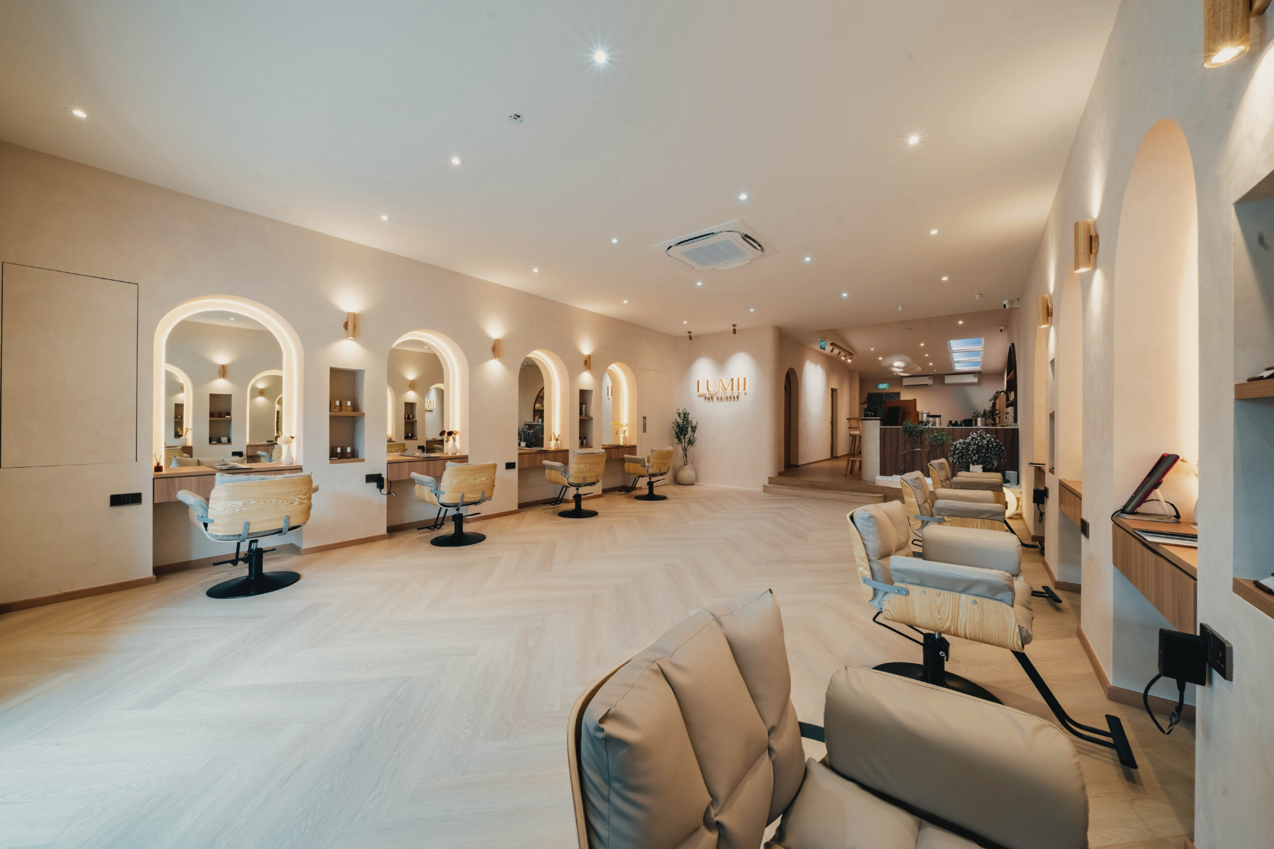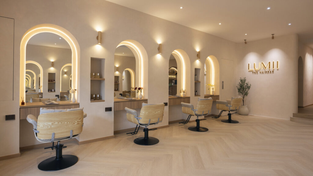 LUMII The Hairbar features a serene and modern retail interior designed to enhance the salon experience. Soft curves, warm lighting, and natural materials contribute to the inviting atmosphere. Arched niches and light timber finishes, along with a neutral color palette, create a calm and welcoming environment. The central LUMII Bar adds a lifestyle element that goes beyond that of a typical hair salon. The overall result is a minimalist yet comfortable space that feels relaxing, refined, and thoughtfully designed for everyday enjoyment.
