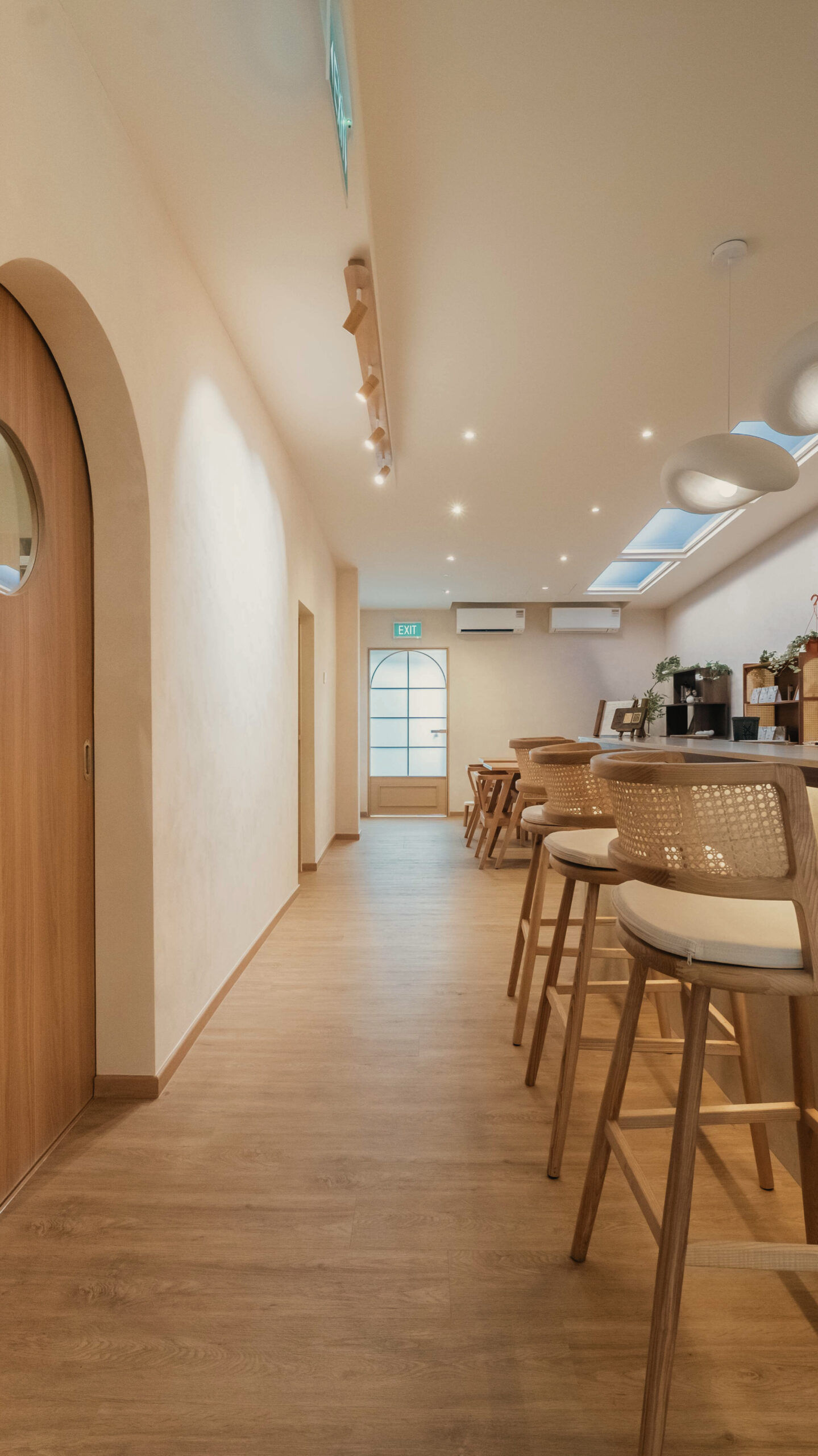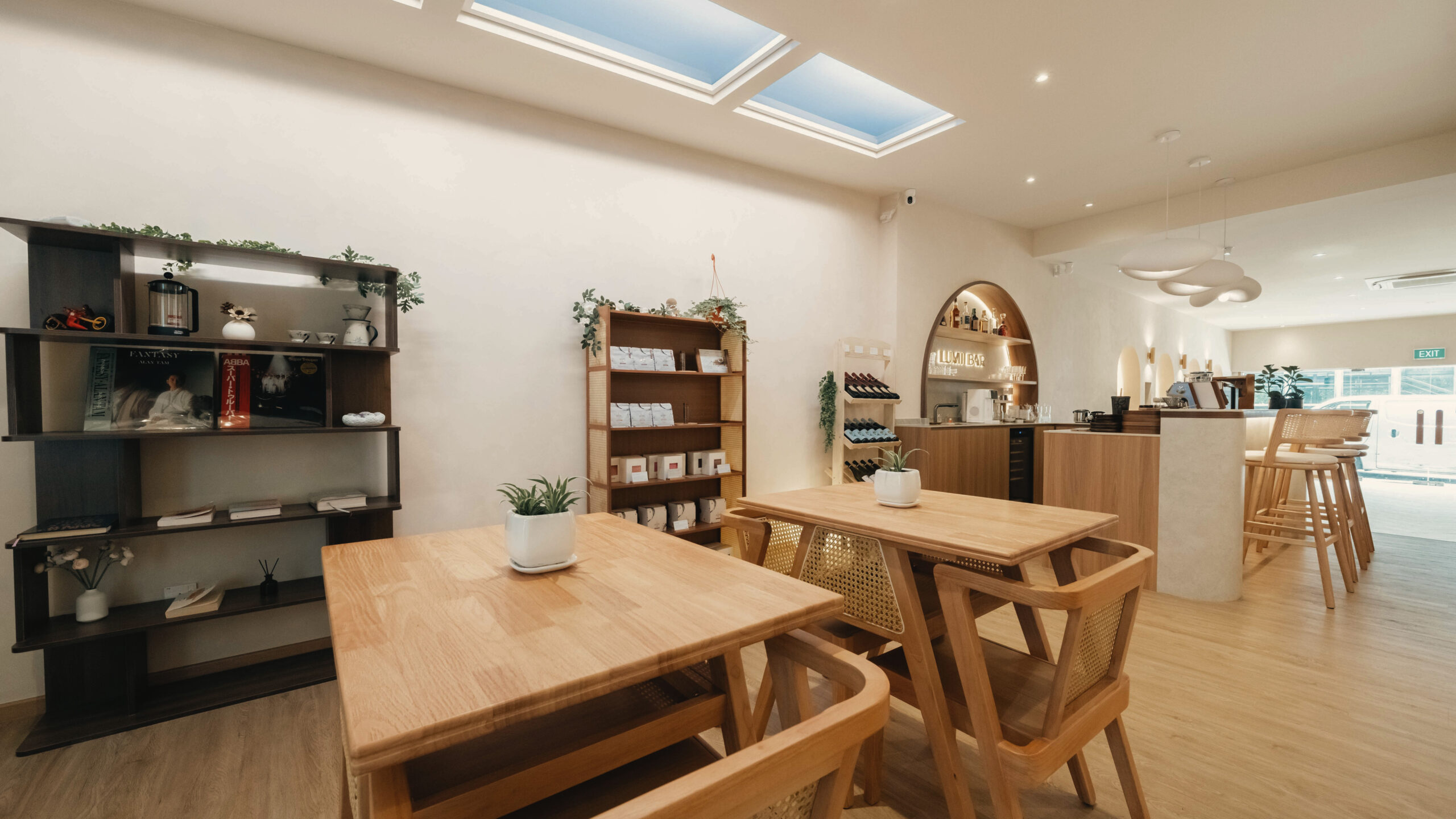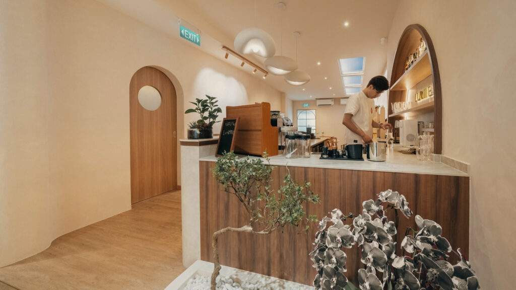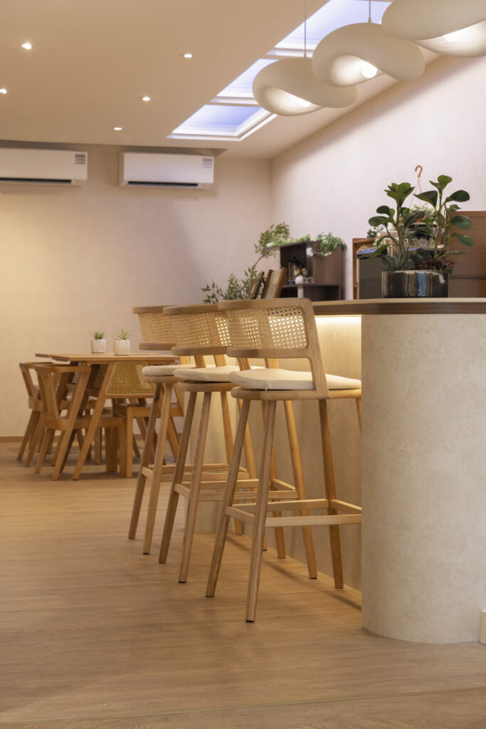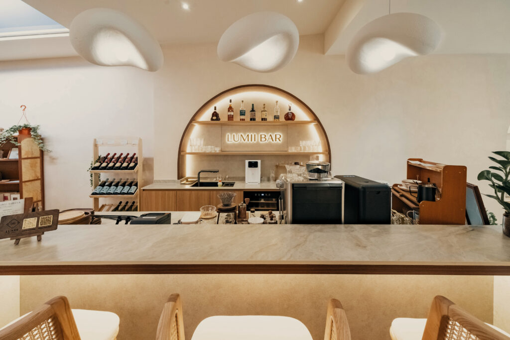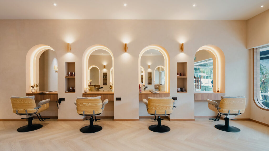 LUMII The Hairbar features a serene and modern retail interior designed to enhance the salon experience. Soft curves, warm lighting, and natural materials contribute to the inviting atmosphere. Arched niches and light timber finishes, along with a neutral color palette, create a calm and welcoming environment. The central LUMII Bar adds a lifestyle element that goes beyond that of a typical hair salon. The overall result is a minimalist yet comfortable space that feels relaxing, refined, and thoughtfully designed for everyday enjoyment.