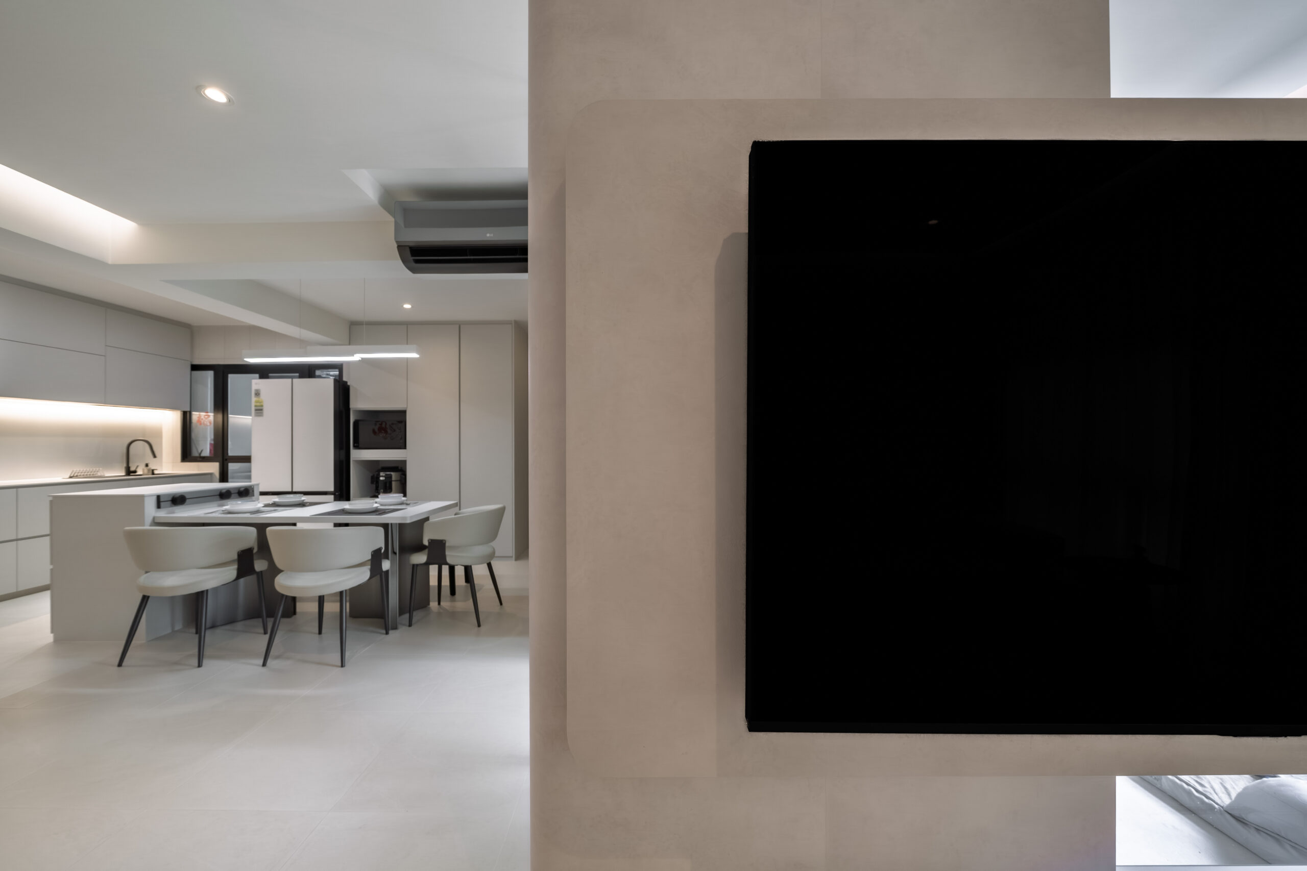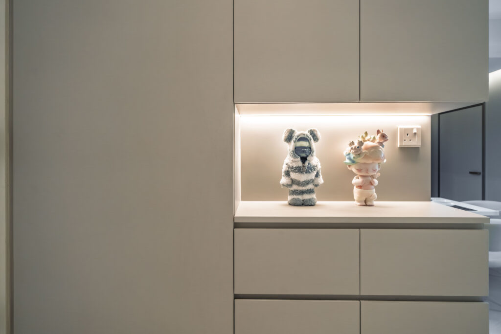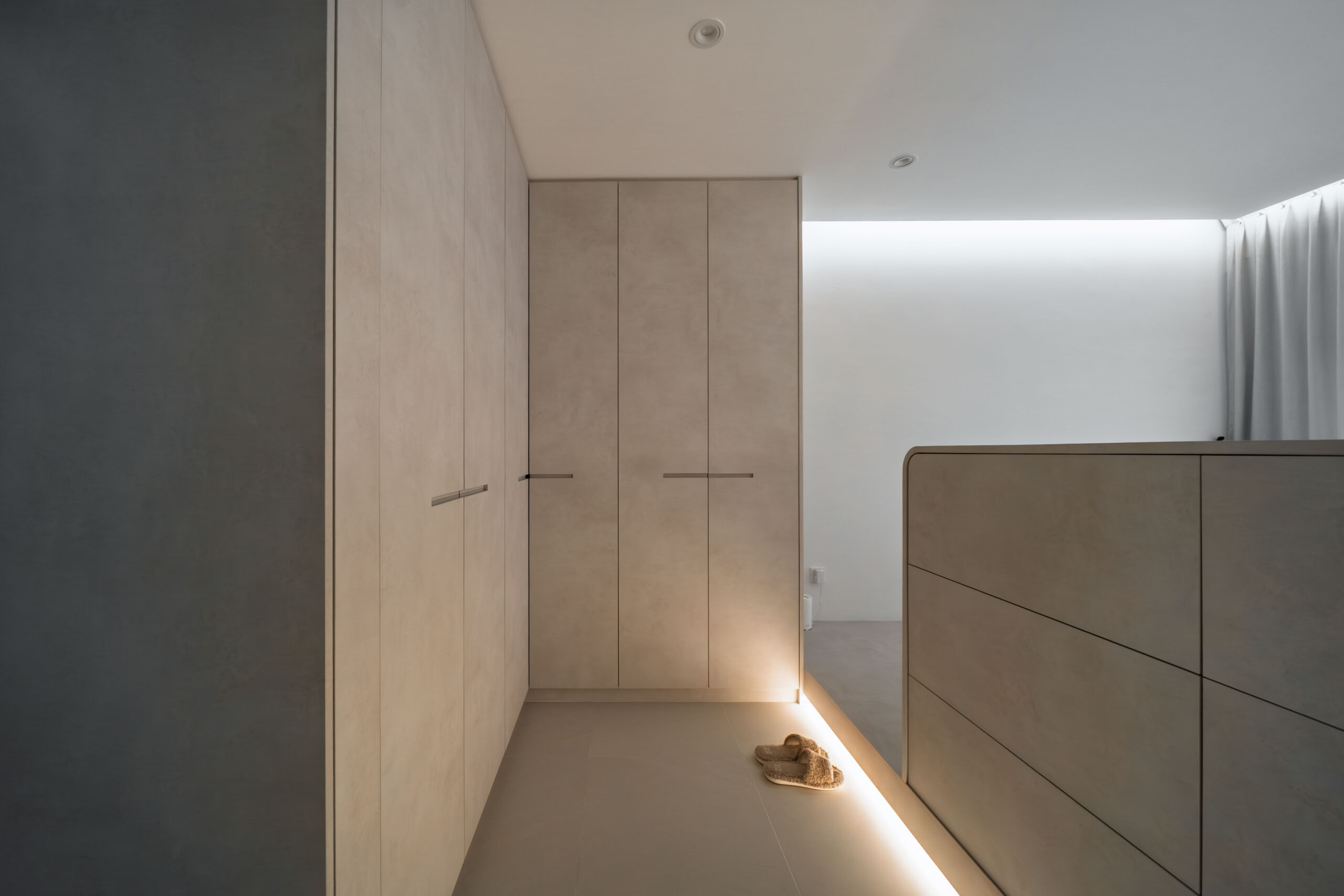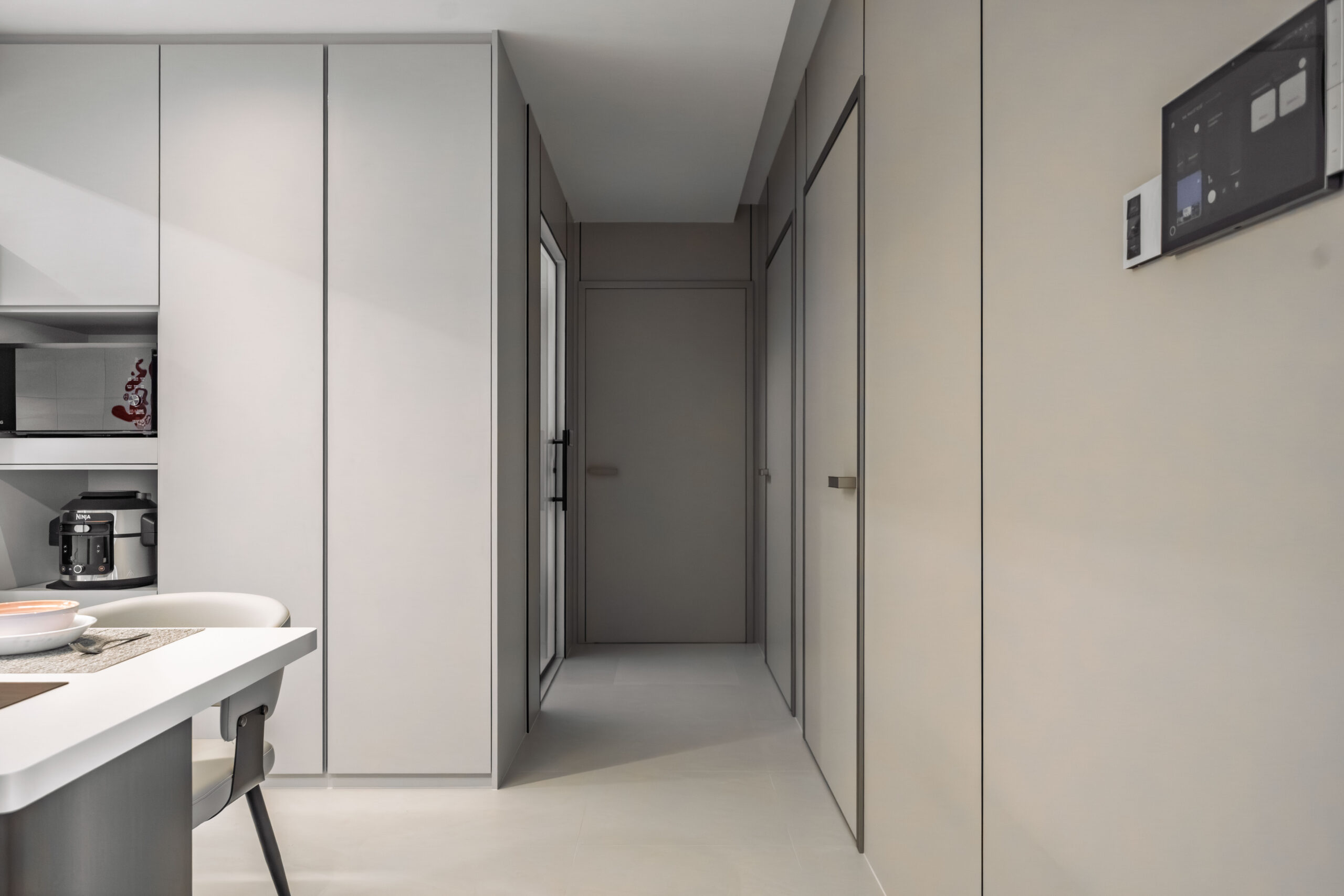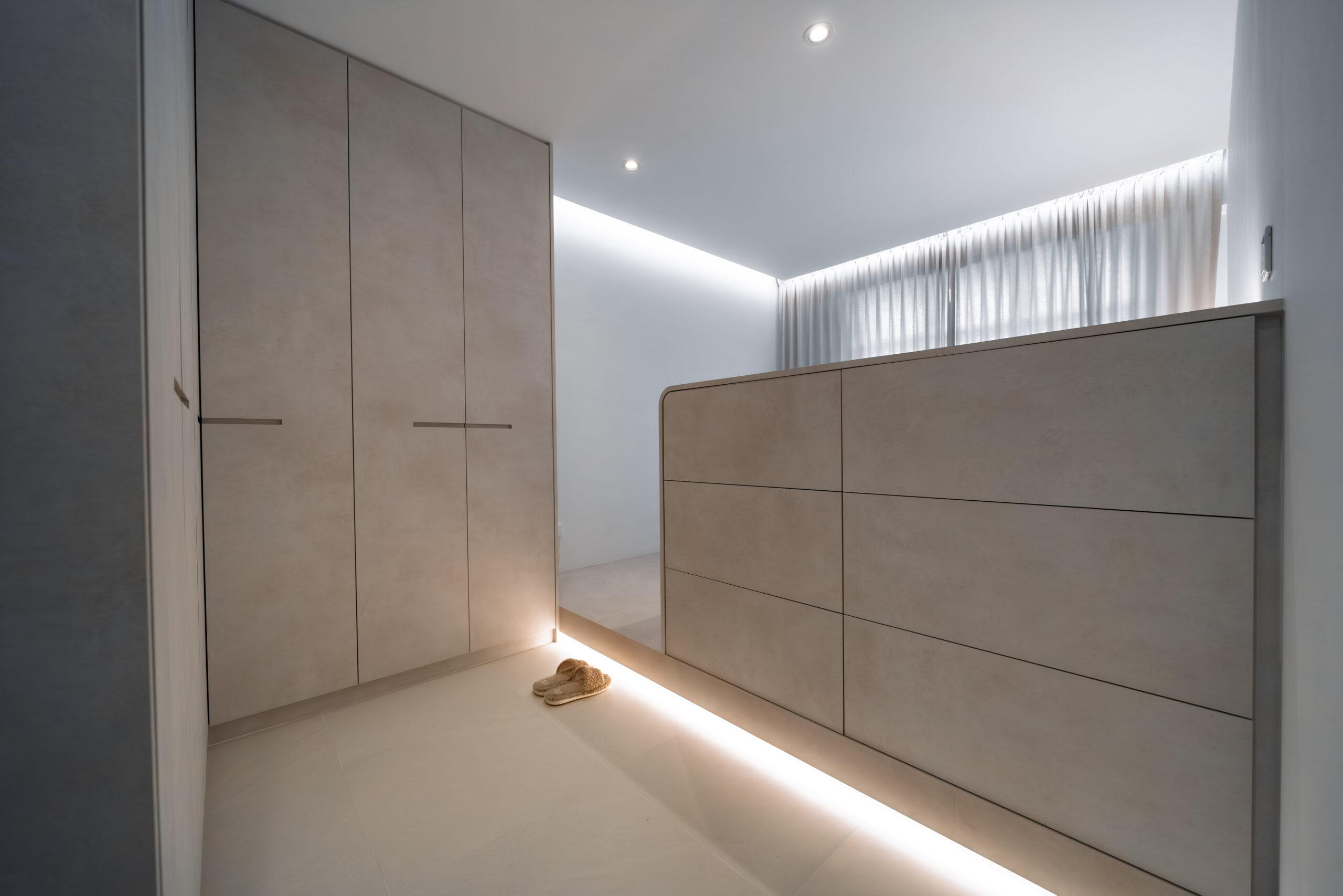 This home showcases a refined minimalist aesthetic, where clean lines and soft neutral tones create a calm, uncluttered first impression. Custom-built cabinetry runs seamlessly along the walls, concealing storage and maintaining a flush, uninterrupted surface. The overall design balances practicality and elegance, transforming a transitional area into a serene and thoughtfully curated introduction to the home.