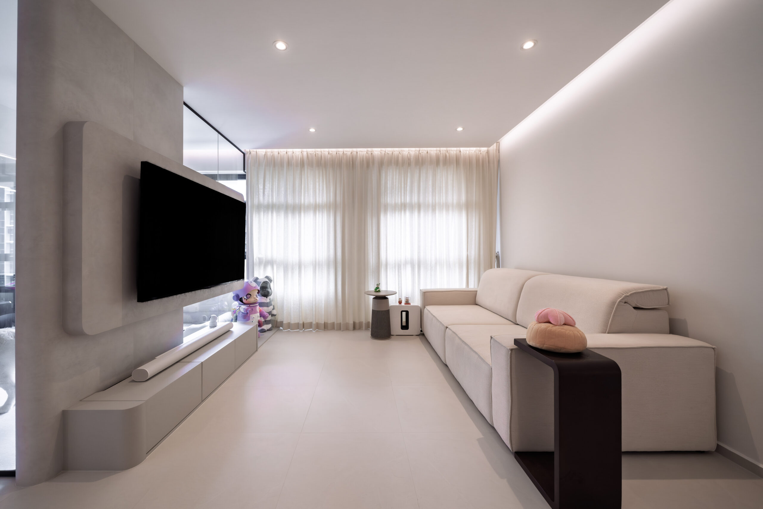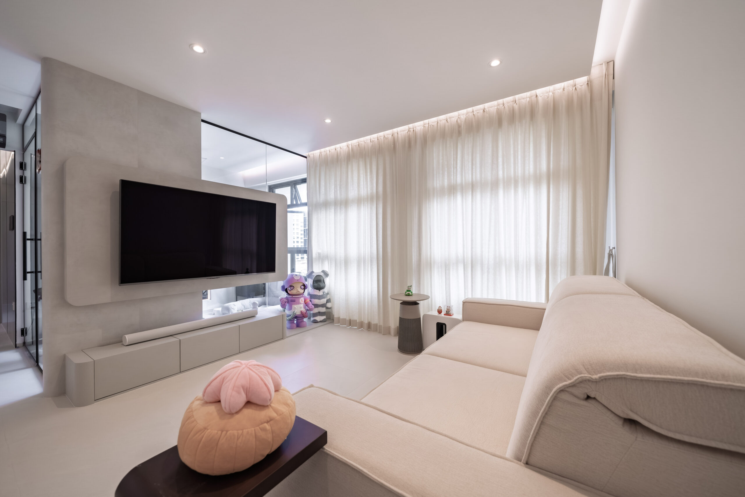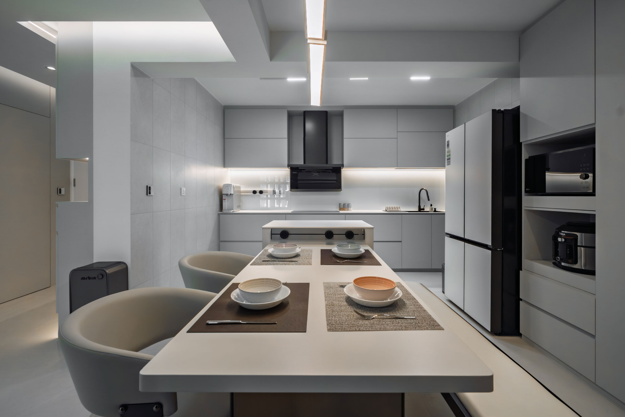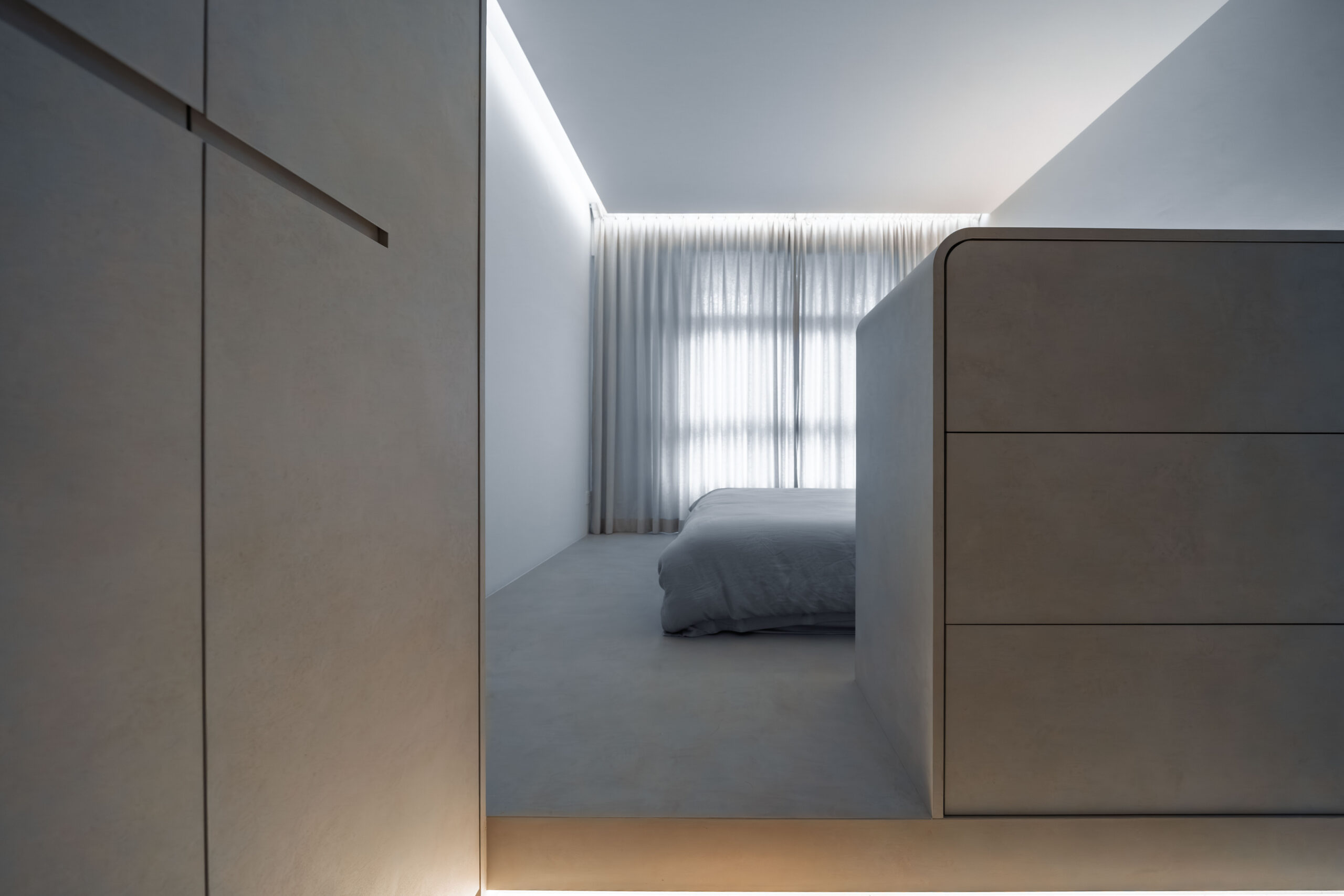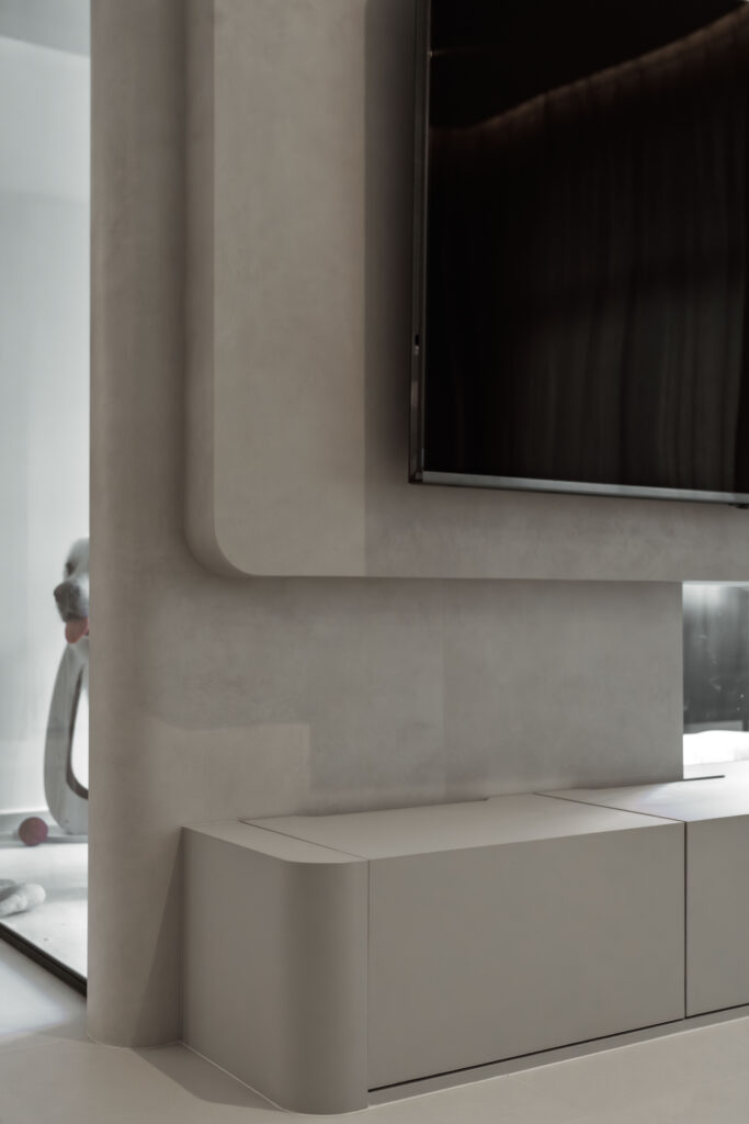 This home showcases a refined minimalist aesthetic, where clean lines and soft neutral tones create a calm, uncluttered first impression. Custom-built cabinetry runs seamlessly along the walls, concealing storage and maintaining a flush, uninterrupted surface. The overall design balances practicality and elegance, transforming a transitional area into a serene and thoughtfully curated introduction to the home.