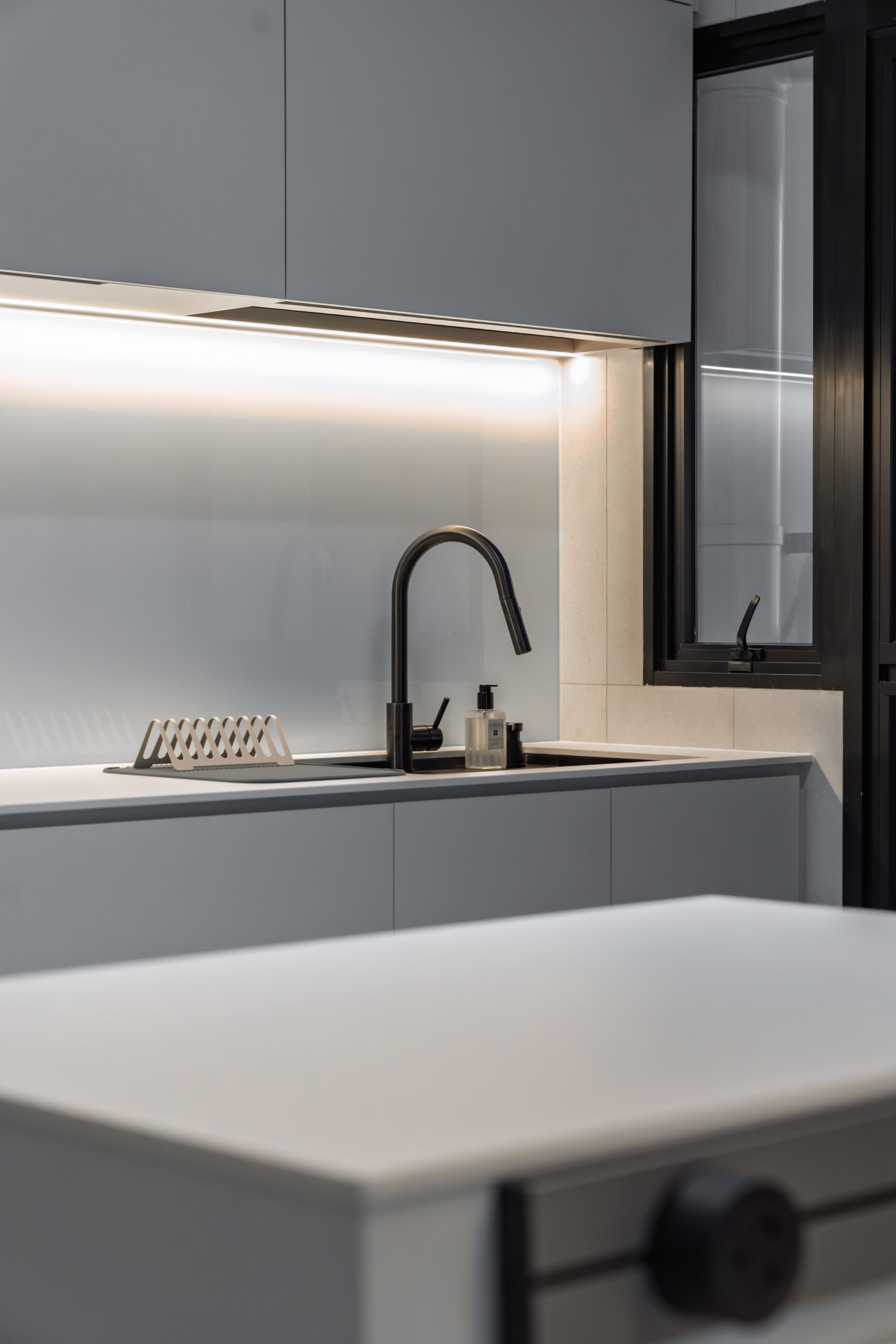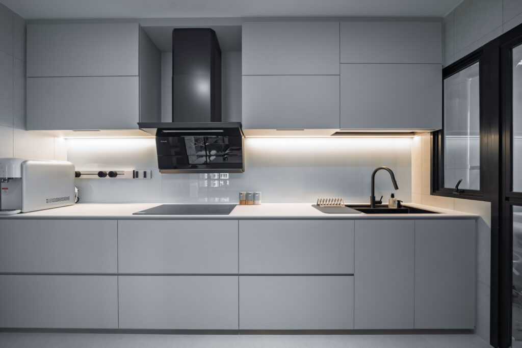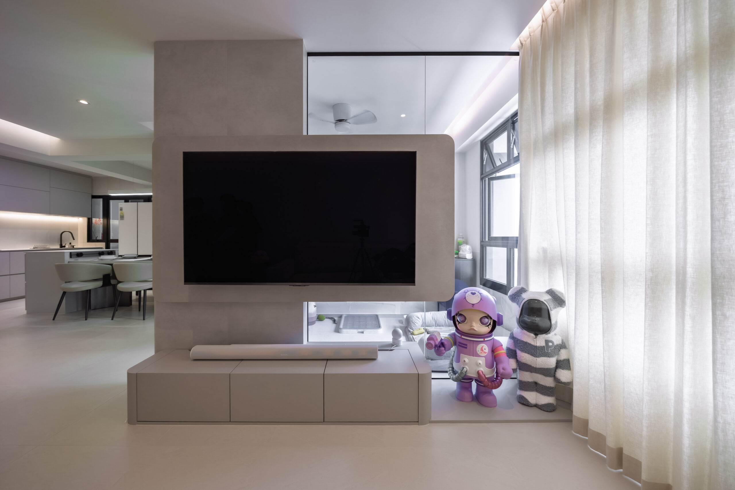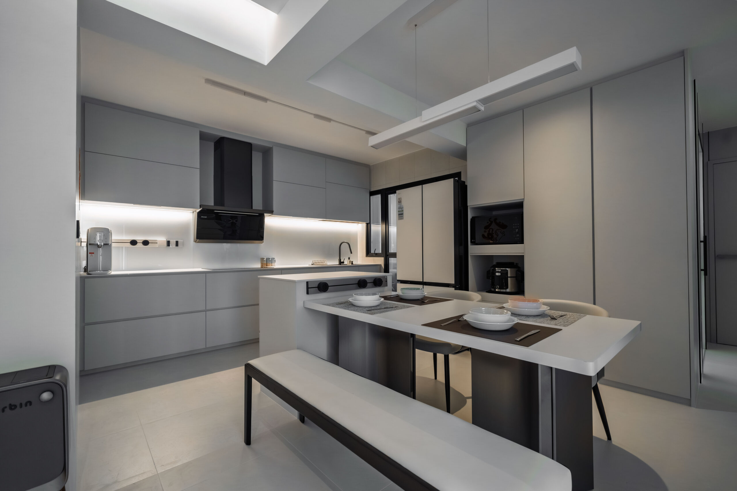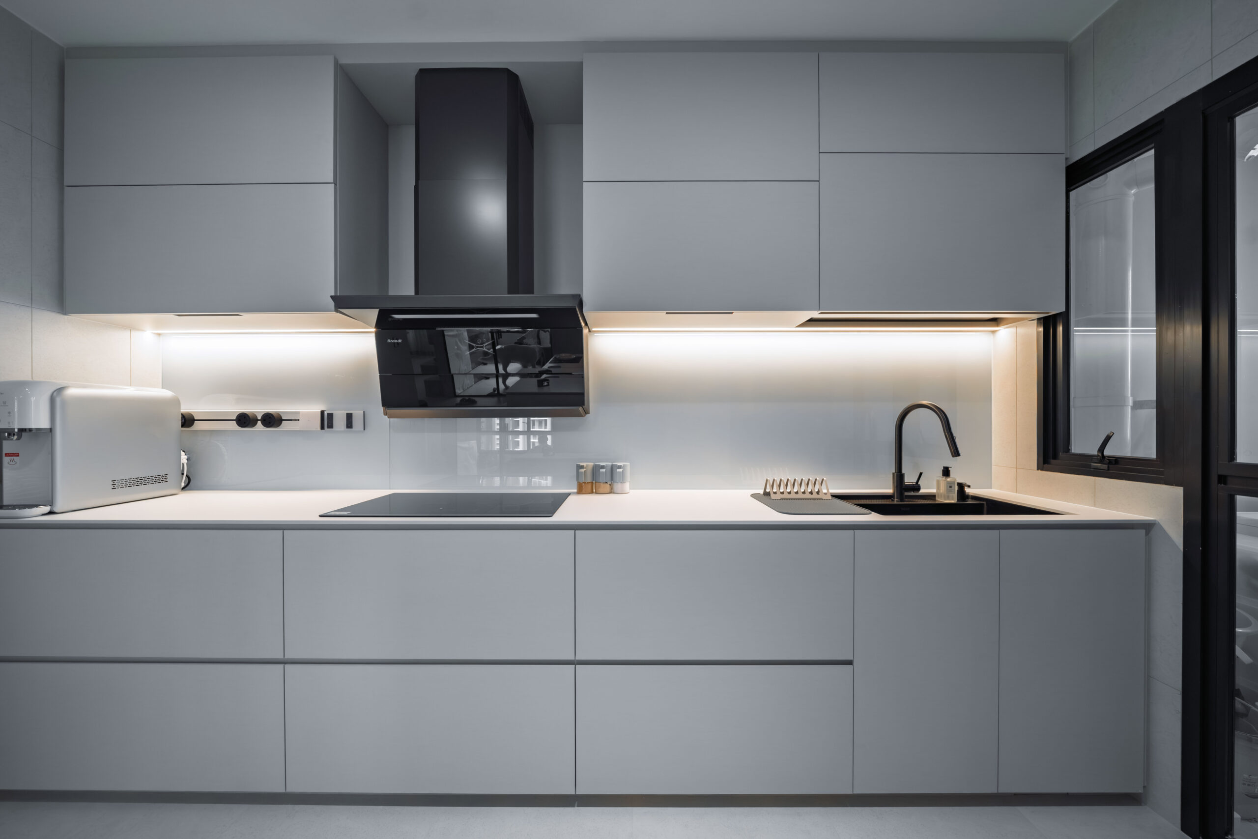 This home showcases a refined minimalist aesthetic, where clean lines and soft neutral tones create a calm, uncluttered first impression. Custom-built cabinetry runs seamlessly along the walls, concealing storage and maintaining a flush, uninterrupted surface. The overall design balances practicality and elegance, transforming a transitional area into a serene and thoughtfully curated introduction to the home.