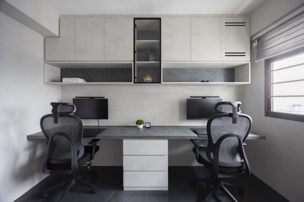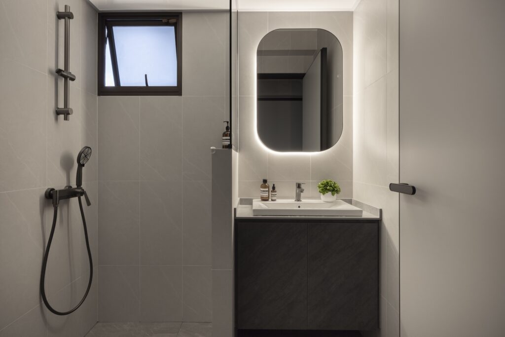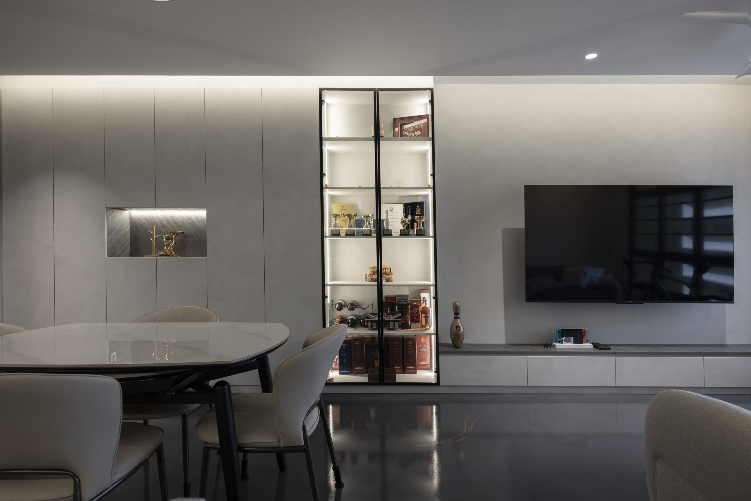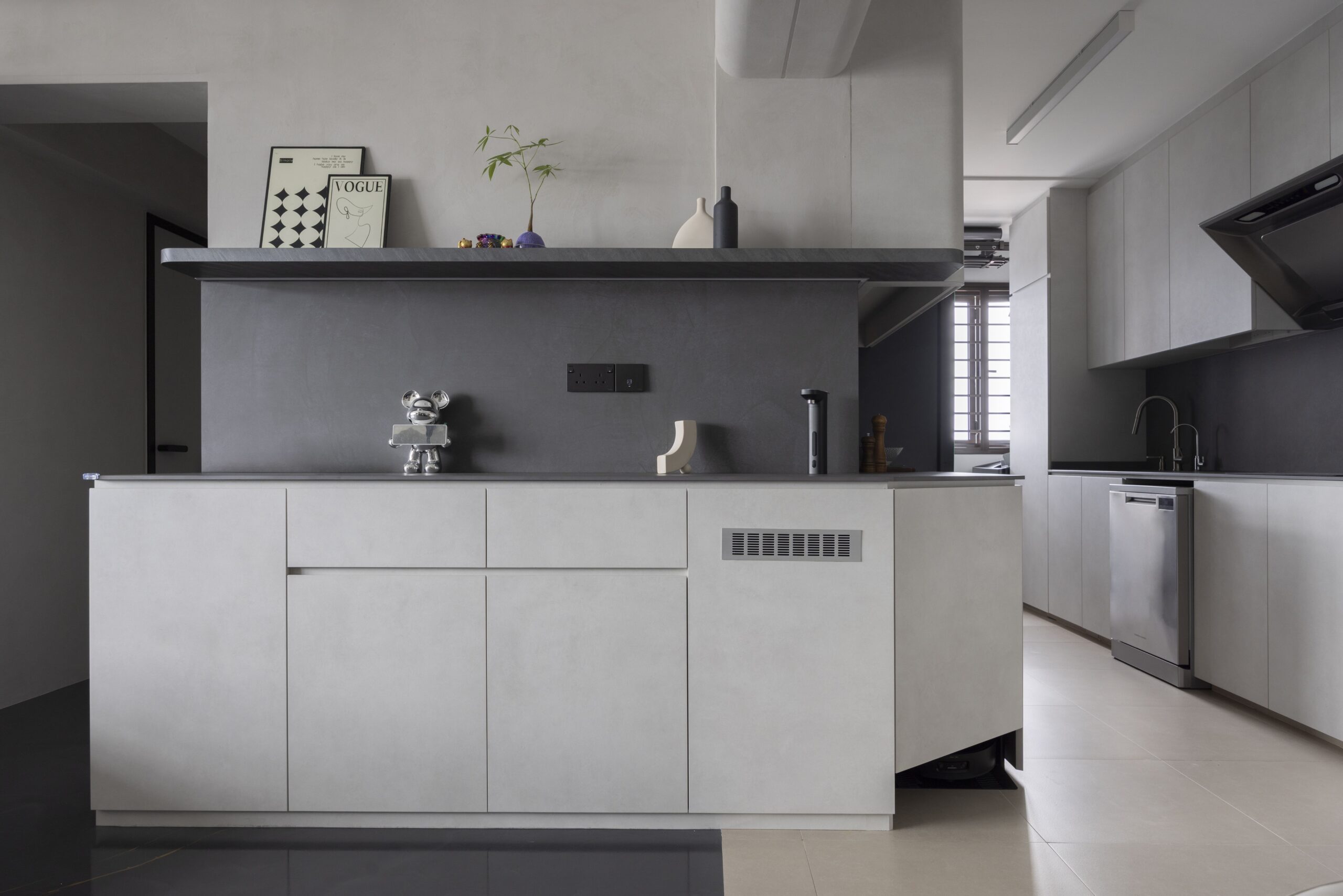 This home on Toa Payoh Ridge is designed for everyday comfort, combining a calm atmosphere with practical and effortlessly modern elements. Soft grey tones throughout the space create a relaxed mood, while clean lines and concealed storage maintain a tidy appearance without feeling sterile. The open living and dining area is airy and inviting, complemented by subtle lighting details and a sleek built-in display that adds character without clutter. The kitchen flows seamlessly into the living space, balancing functionality with understated style, making it perfect for both daily meals and casual entertaining. A dedicated study area is thoughtfully designed for focus and productivity, featuring ample storage and a clean workspace. In the bathroom, simple finishes and warm lighting create a spa-like ambiance, transforming everyday routines into moments of tranquility. Overall, this home reflects the modern Singapore lifestyle—practical, cozy, and designed to age beautifully over time.