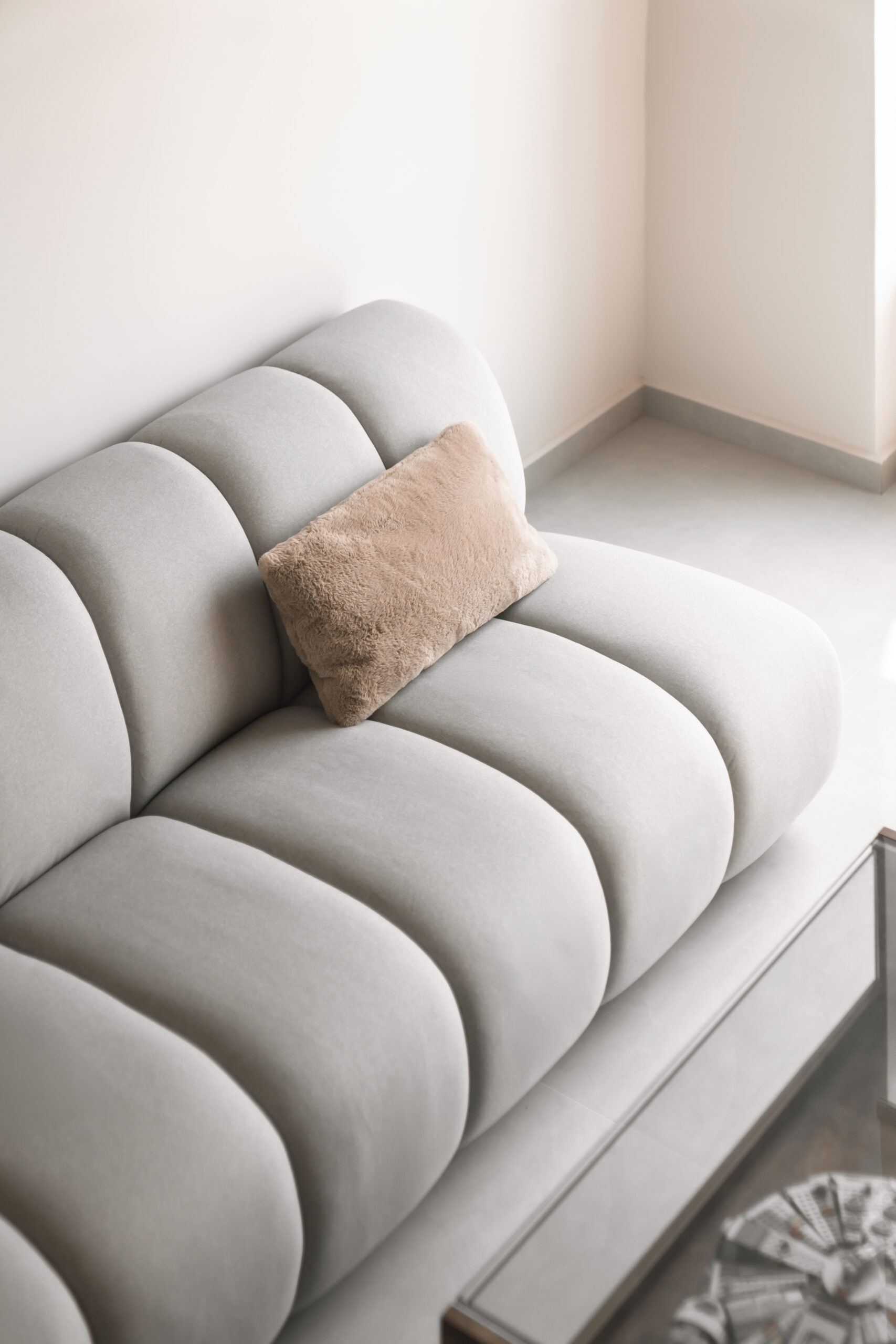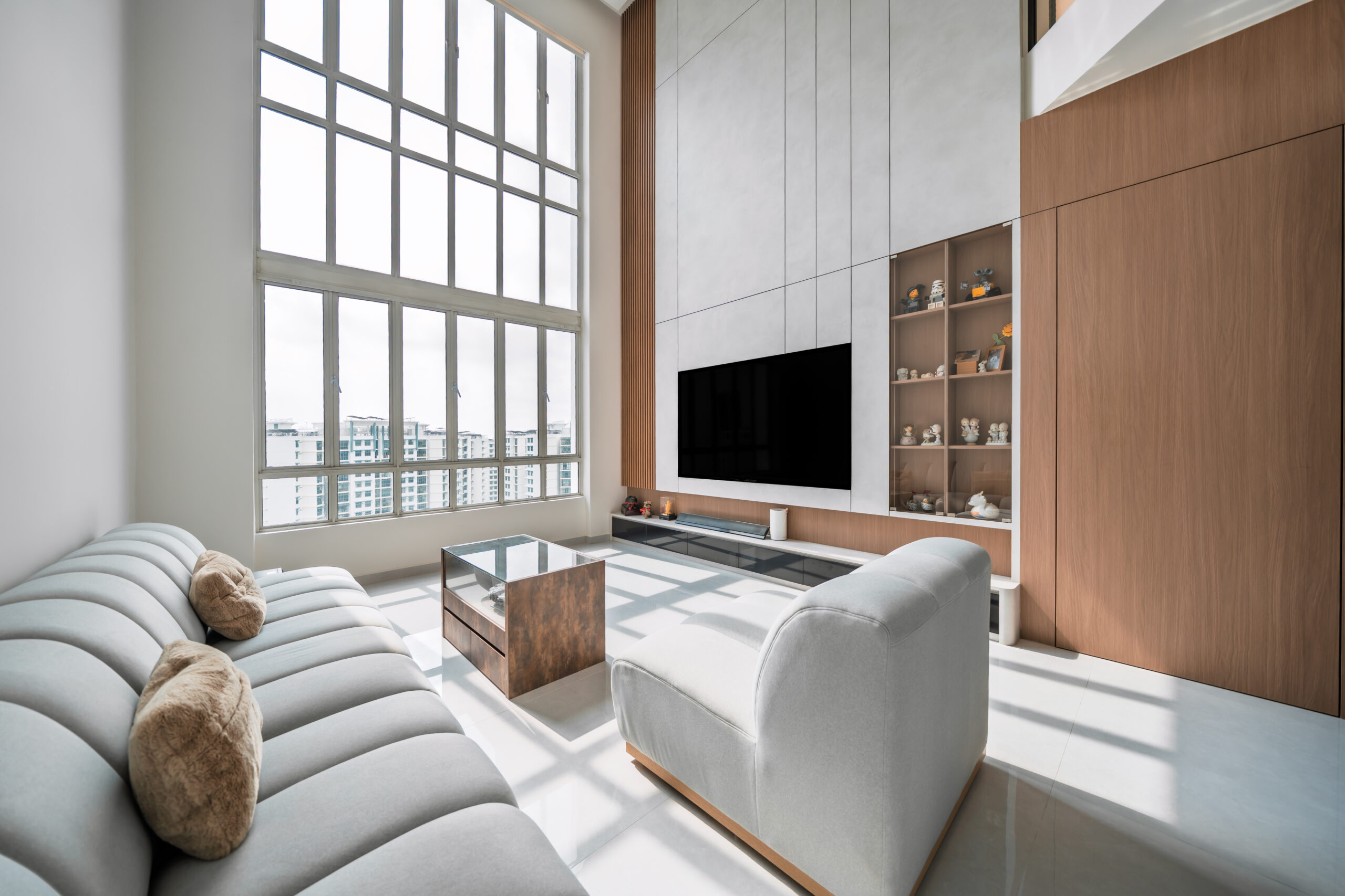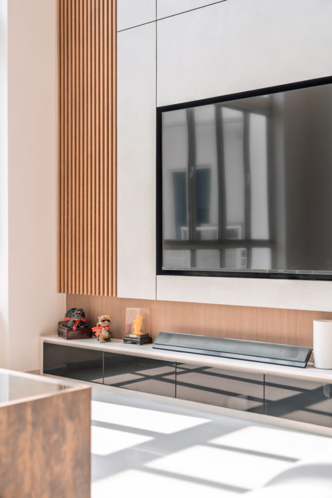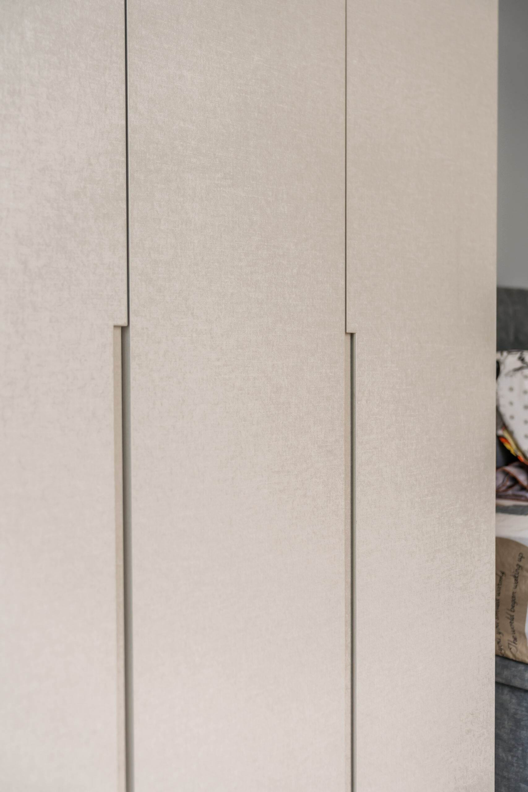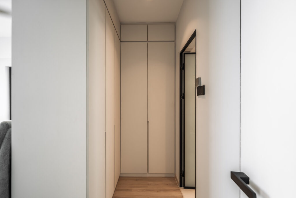The palette in this home stays intentionally restrained — soft neutrals, warm whites, and subtle textures, allowing the architecture to take center stage. Full-height cabinetry along the wall enhances the verticality, while keeping storage seamlessly concealed for a clean, uninterrupted look. It’s a home that doesn’t try too hard, because when proportions, light, and restraint come together like this, the result speaks for itself.