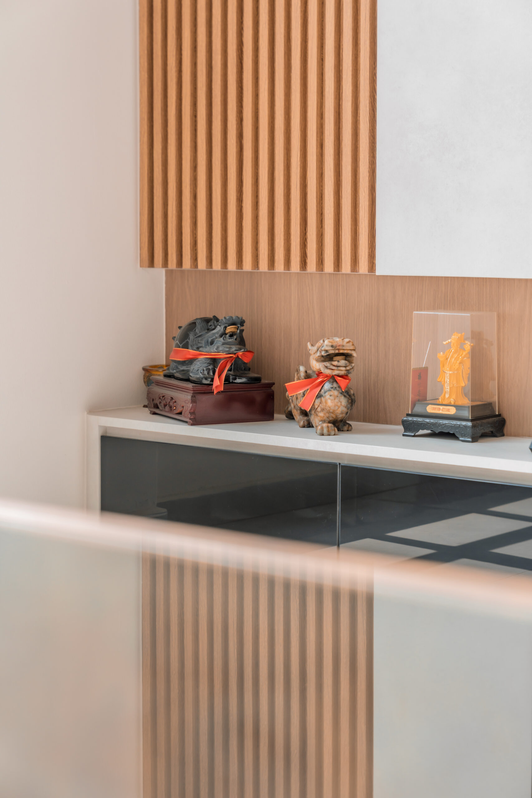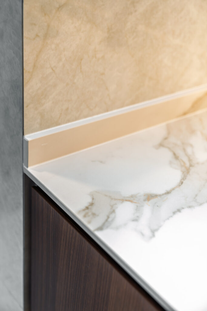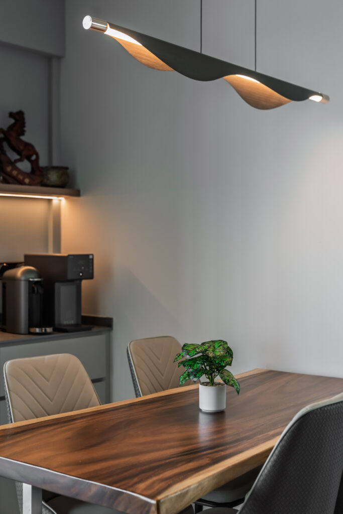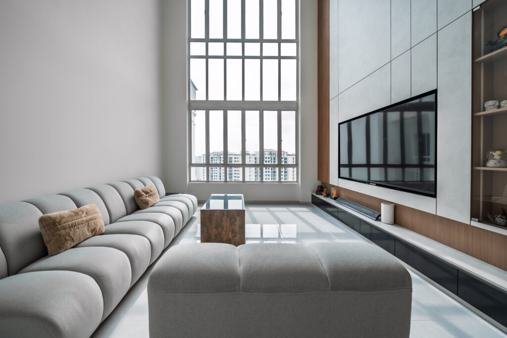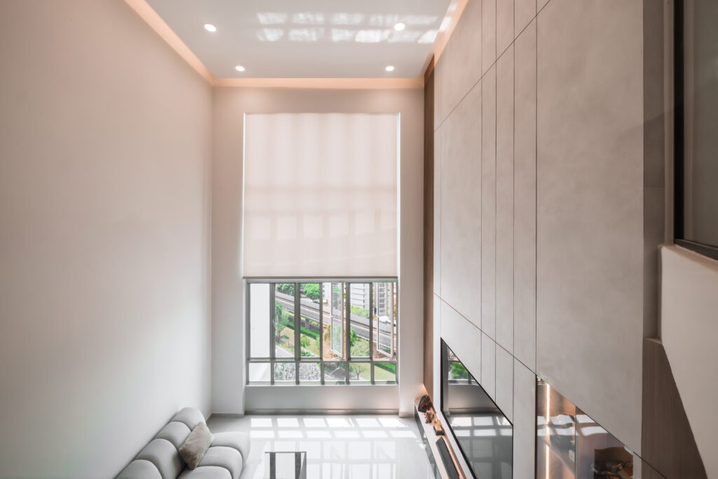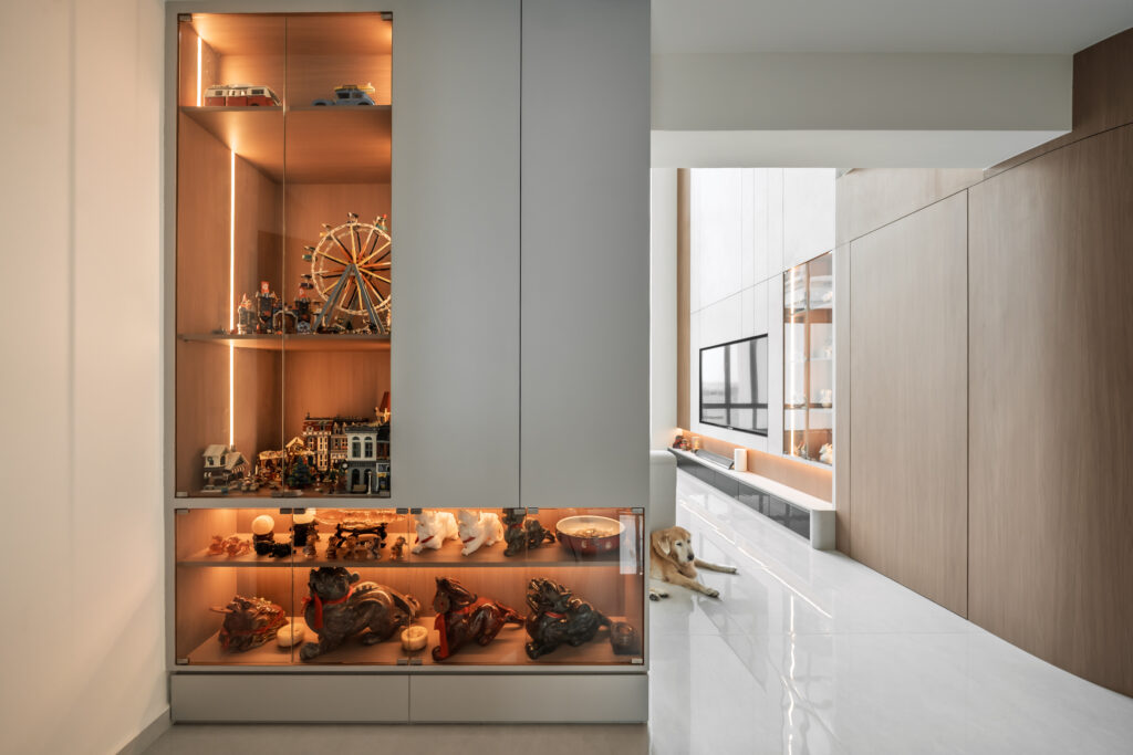The palette in this home stays intentionally restrained — soft neutrals, warm whites, and subtle textures, allowing the architecture to take center stage. Full-height cabinetry along the wall enhances the verticality, while keeping storage seamlessly concealed for a clean, uninterrupted look. It’s a home that doesn’t try too hard, because when proportions, light, and restraint come together like this, the result speaks for itself.
