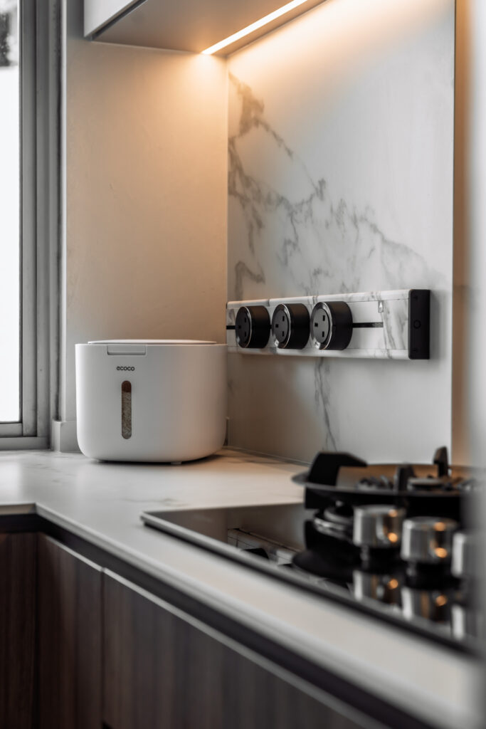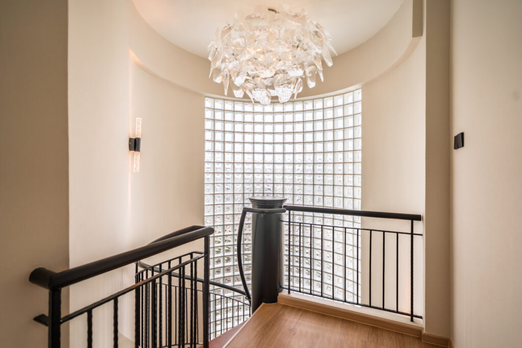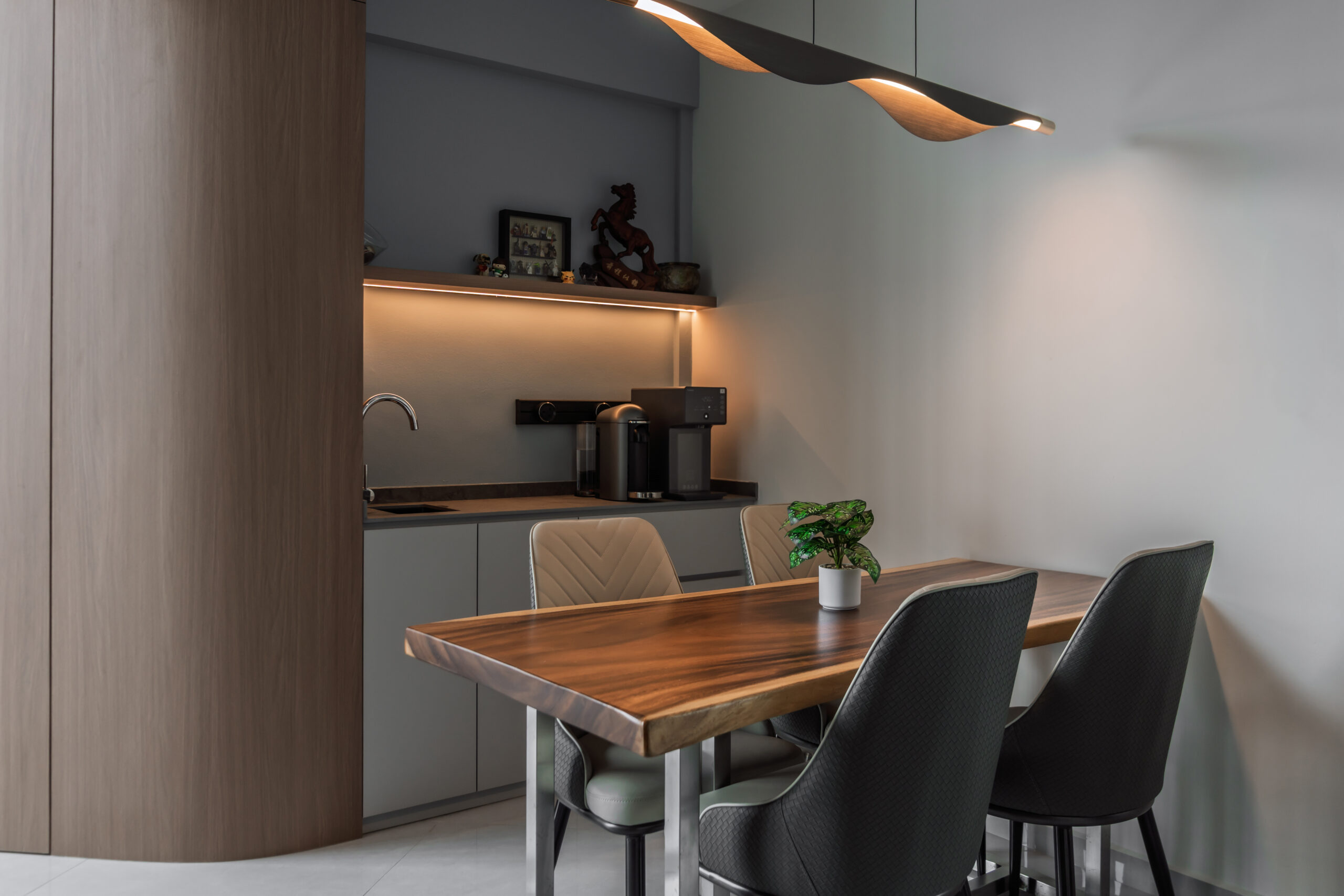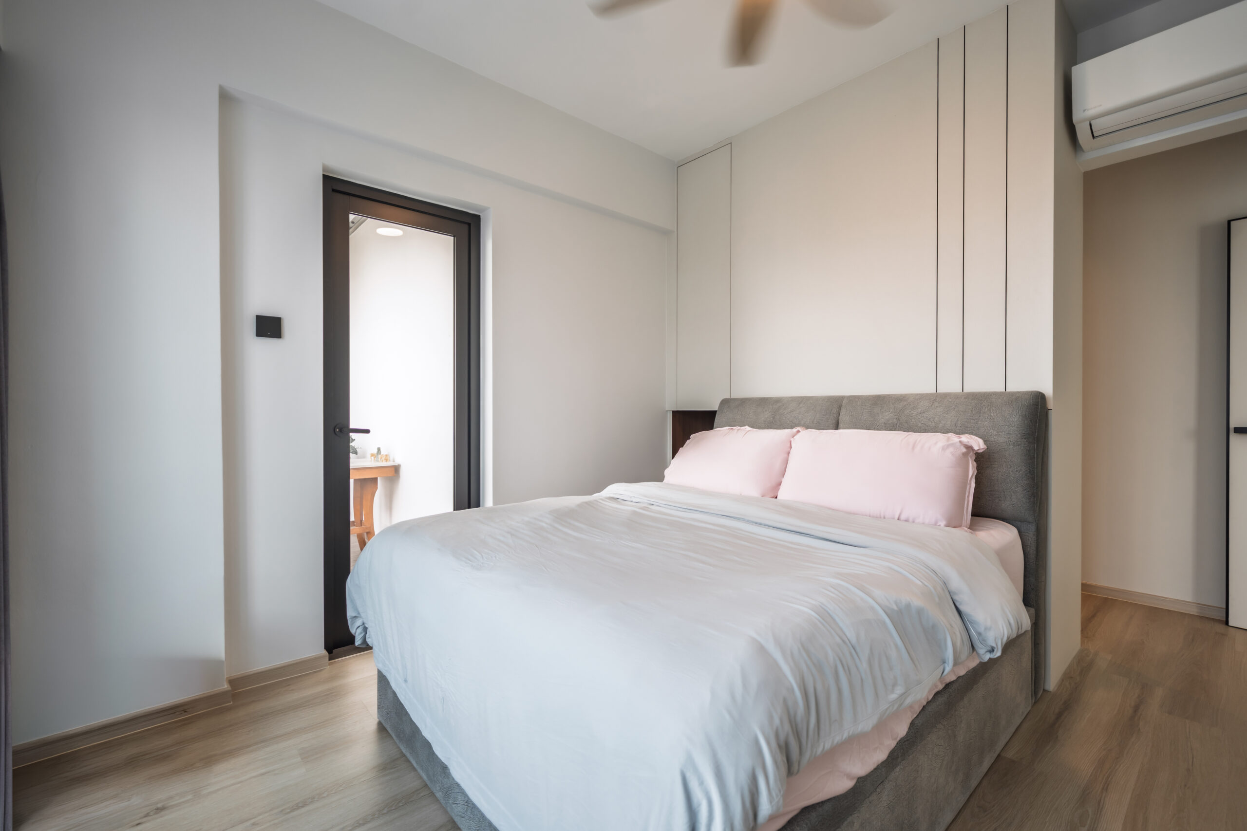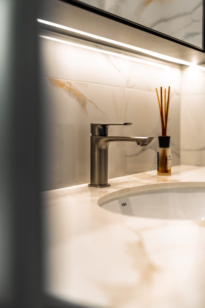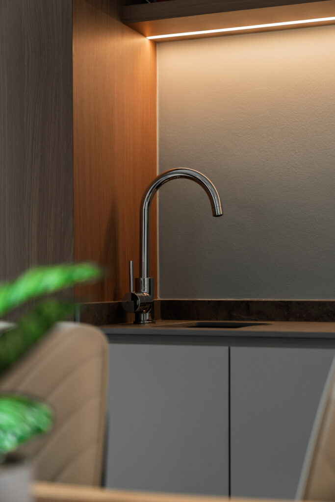 The palette in this home stays intentionally restrained — soft neutrals, warm whites, and subtle textures, allowing the architecture to take center stage. Full-height cabinetry along the wall enhances the verticality, while keeping storage seamlessly concealed for a clean, uninterrupted look. It’s a home that doesn’t try too hard, because when proportions, light, and restraint come together like this, the result speaks for itself.